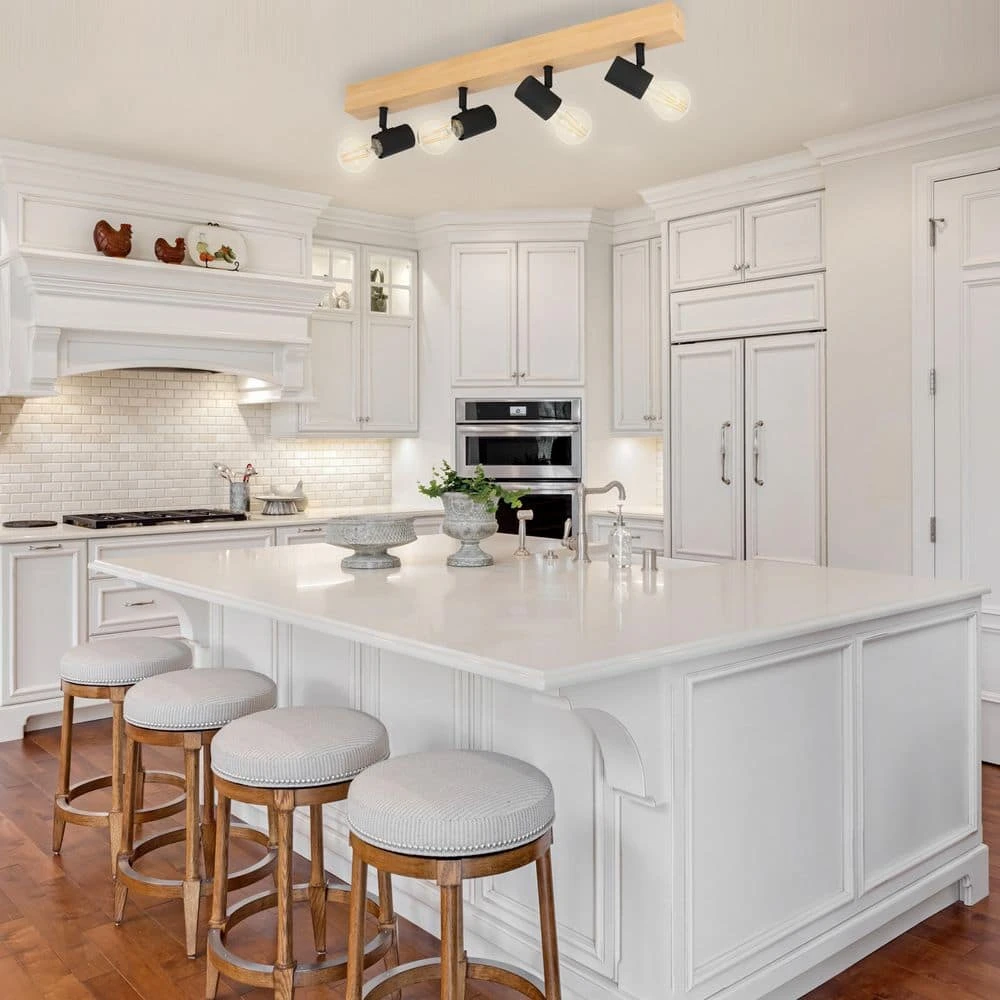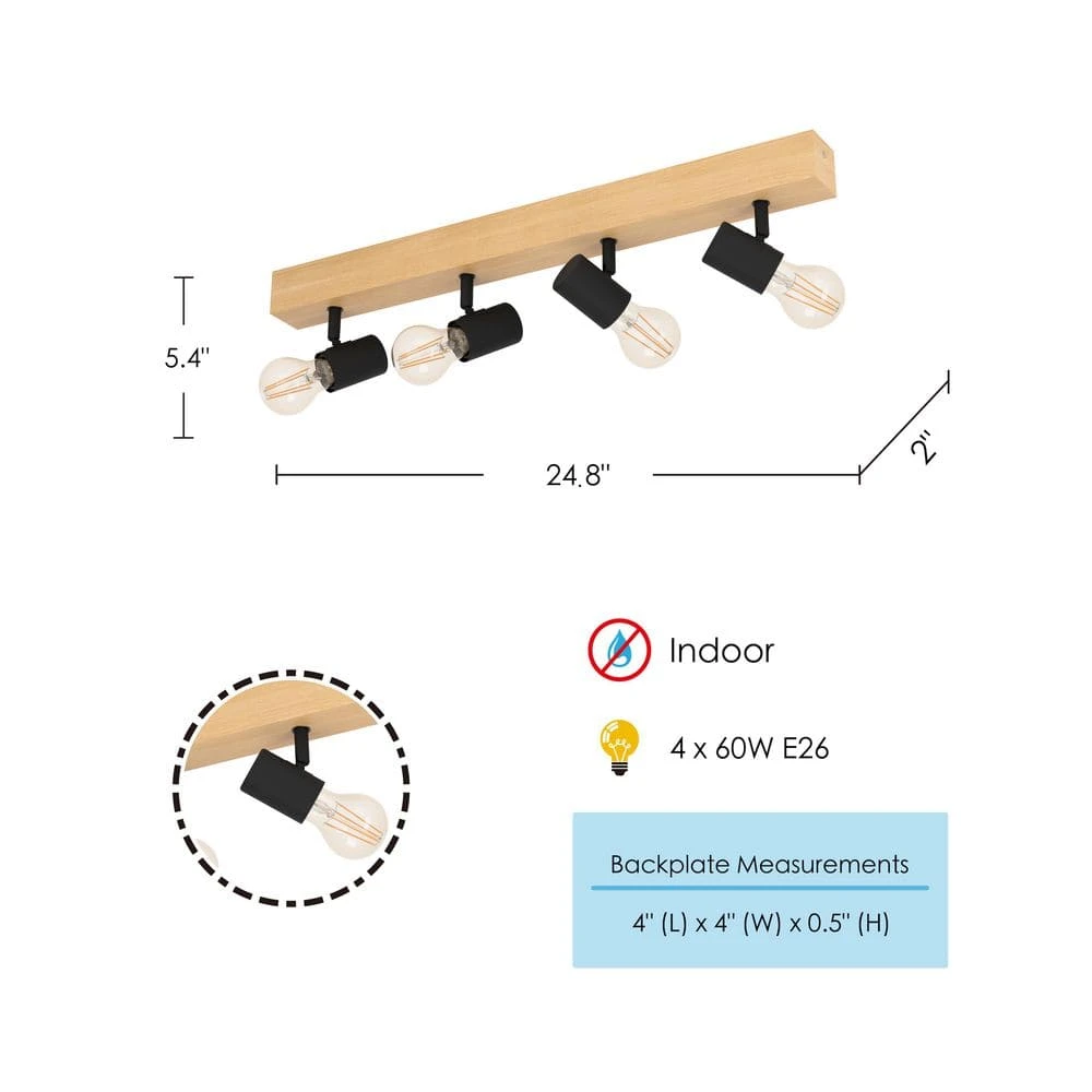 Eglo’s Kingwood family has a minimalist meets vintage style. The 4-Light wooden track has accent black finishes to provide unique style to your living space. This contemporary piece blends well with numerous interior designs. Great for studios, offices, coffee bars and more.