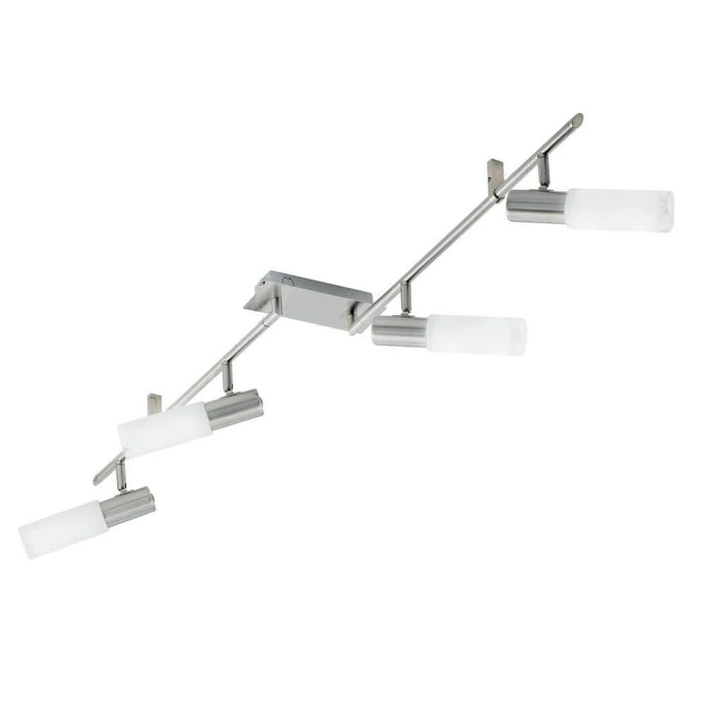 The Eglo Samanta 4-Light Matte Nickel Transitional Track Lighting Fixture is designed for use with a fluorescent light source and is UL listed for safety. The fixture comes in a matte nickel finish for aesthetic appeal and features 4 track heads with a 90°pivot function for versatility. Uses four 7-Watt CFL bulbs with a candelabra base (not included).