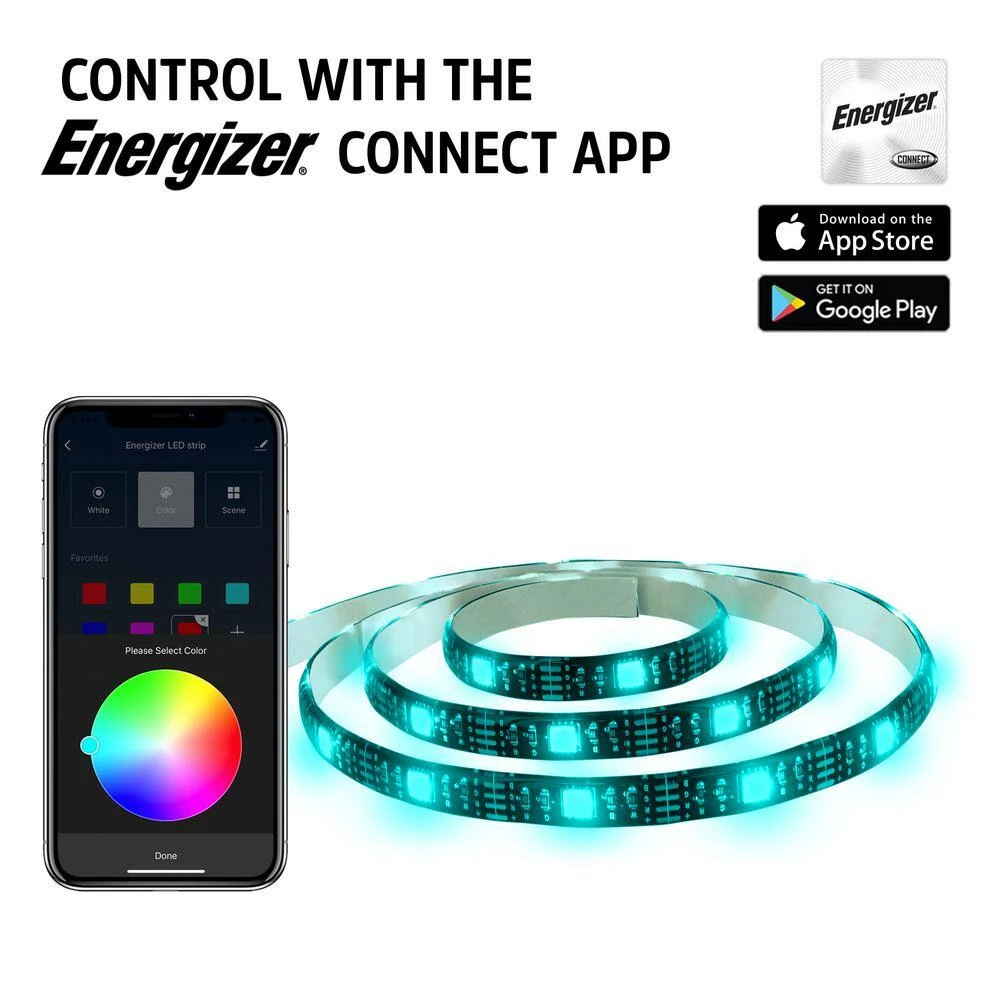 The Energizer Connect Smart LED Light Strip with voice control works with Amazon Alexa and Google assistance. It is an easy DIY Installation using peel and stick adhesive tape or using mounting clips and requires no hub, just use your existing Wi-Fi. The remote access makes it easy to turn the light on or off anywhere you are. Best yet, scheduling allows you to create schedules to turn your Smart LED Strip on and off and sciences allows you to create scenes that can be executed manually or conditionally.