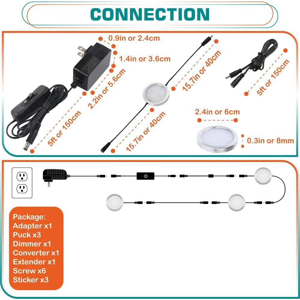 Transform your kitchen, closet, or living space with Under Cabinet Lighting Dimmable LED Puck Lights. Designed for modern convenience, these low-profile LED puck lights provide a seamless blend of functionality and style. With a touch-sensitive dimmer, you can adjust brightness effortlessly from 0 to 100%, creating the perfect ambiance for any occasion. The energy-saving LED design reduces electricity bills, making it an eco-friendly and cost-effective lighting solution. Easy to install, the kit includes everything you need for a hassle-free setup with screws or adhesive stickers for secure mounting. Plus, the plug-in power adapter ensures quick plug-and-play functionality, offering a safe and reliable lighting experience.