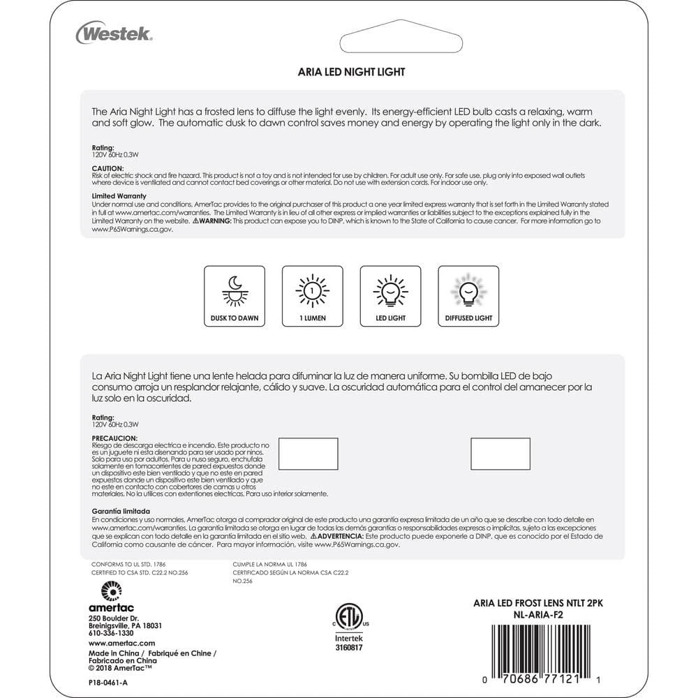 The Westek NL-ARIA-F2 Aria Curve Night Light is the perfect night time lighting solution. This device automatically turns on in low light with 1 lumen of vivid illumination through a frosted lens; enough to see by without being obtrusive. Great for hallways, entryways, basements, bathrooms and more. Designed with a modern style that works with any decor. AmerTac manufacturing brands offer complete lines of distinctive decorative home accent products that include trend-setting wall plates, money saving LED night lights, innovative under cabinet lighting and LED battery operated lights. We also offer utility product lines including energy-saving timers, dimmers and lighting controls, as well as an extensive offering of consumer electronics accessories for the home and office.