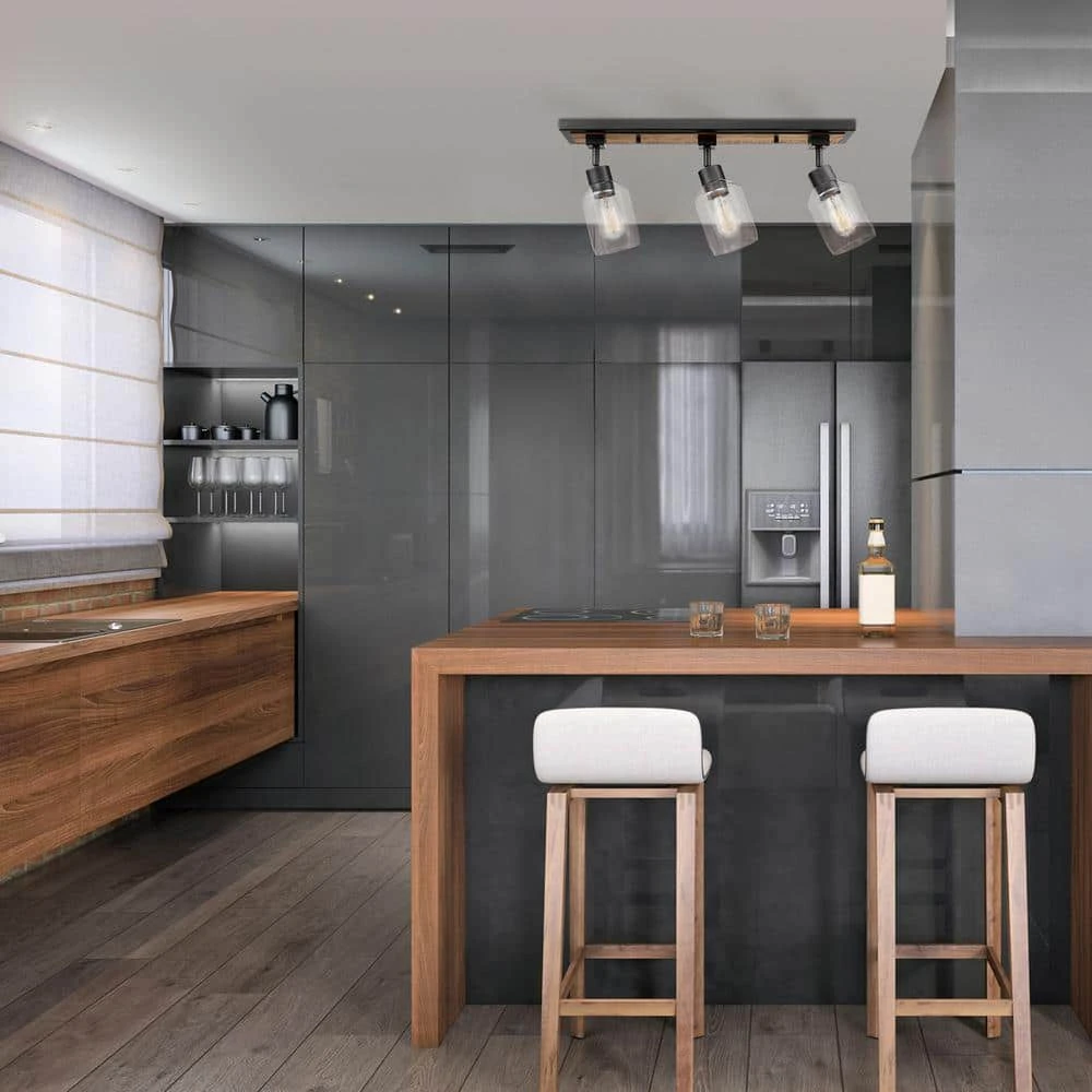 - Rustic farmhouse design: the warm dark wood finish and dark metal accents of the Griffith 3-light track bar is perfect for bringing an inviting turn-of-the-century rustic farmhouse look to any area