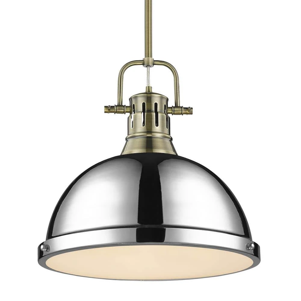 Transform the look of your room with this classic, vintage-inspired fixture by Golden Lighting. Golden Lighting’s Duncan collection is contemporary style with an industrial feel. The collection features a variety of simple, traditional silhouettes that are a nod to a bygone era. A variety of plated and painted metal shade finishes are offered in combination with durable Aged Brass, Chrome or Pewter fixture bodies. Rubbed Bronze fixtures are paired with Rubbed Bronze shades. This large, rod-hung pendant features a glass diffuser and is comfortably sized for a small nook or island. The pendant may be hung individually or arrayed as a set.