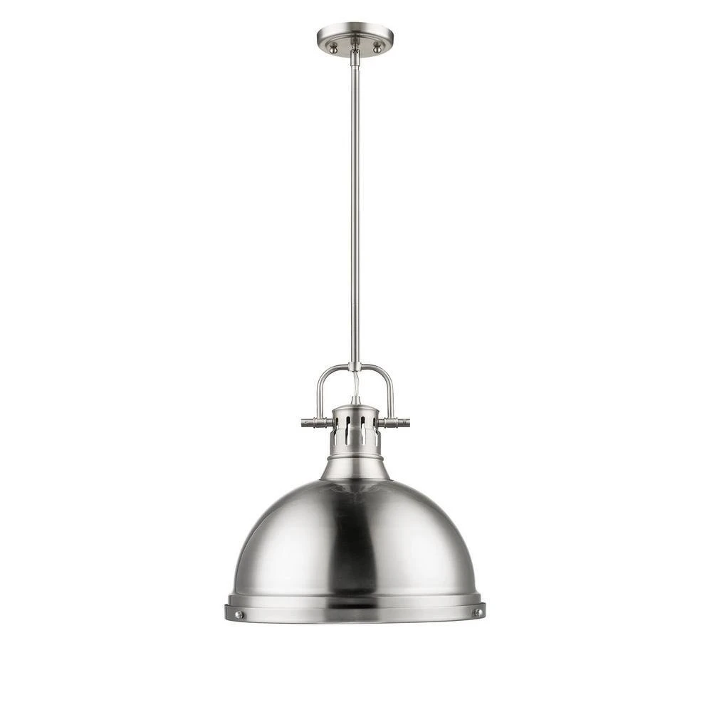 Transform the look of your room with this classic, vintage-inspired fixture by Golden Lighting. Golden Lighting’s Duncan collection is contemporary style with an industrial feel. The collection features a variety of simple, traditional silhouettes that are a nod to a bygone era. A variety of plated and painted metal shade finishes are offered in combination with durable Aged Brass, Chrome or Pewter fixture bodies. Rubbed Bronze fixtures are paired with Rubbed Bronze shades. This large, rod-hung pendant features a glass diffuser and is comfortably sized for a small nook or island. The pendant may be hung individually or arrayed as a set.