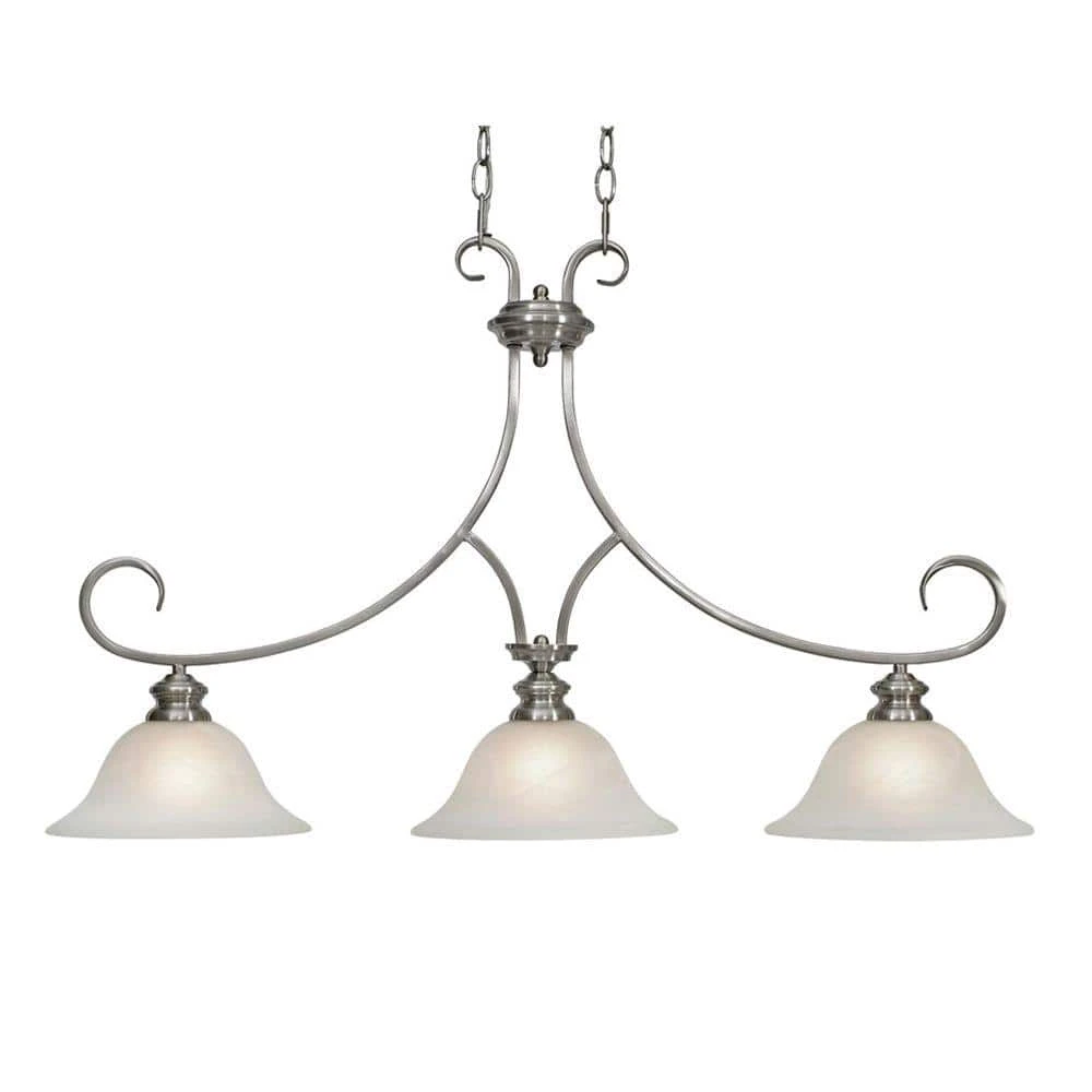 With gentle, sloping lines and diffused warm light, the Starke collection suits the soft modern or soft traditional home. Squared arms follow subtle curves for a strong contemporary feel of elegance, and the cool Pewter finish adds a nuance of icy sophistication. Marbled Glass completes the look of tasteful elegance. This 3 light linear pendant illuminates a kitchen bar or dining table without interfering with activity on the surface.