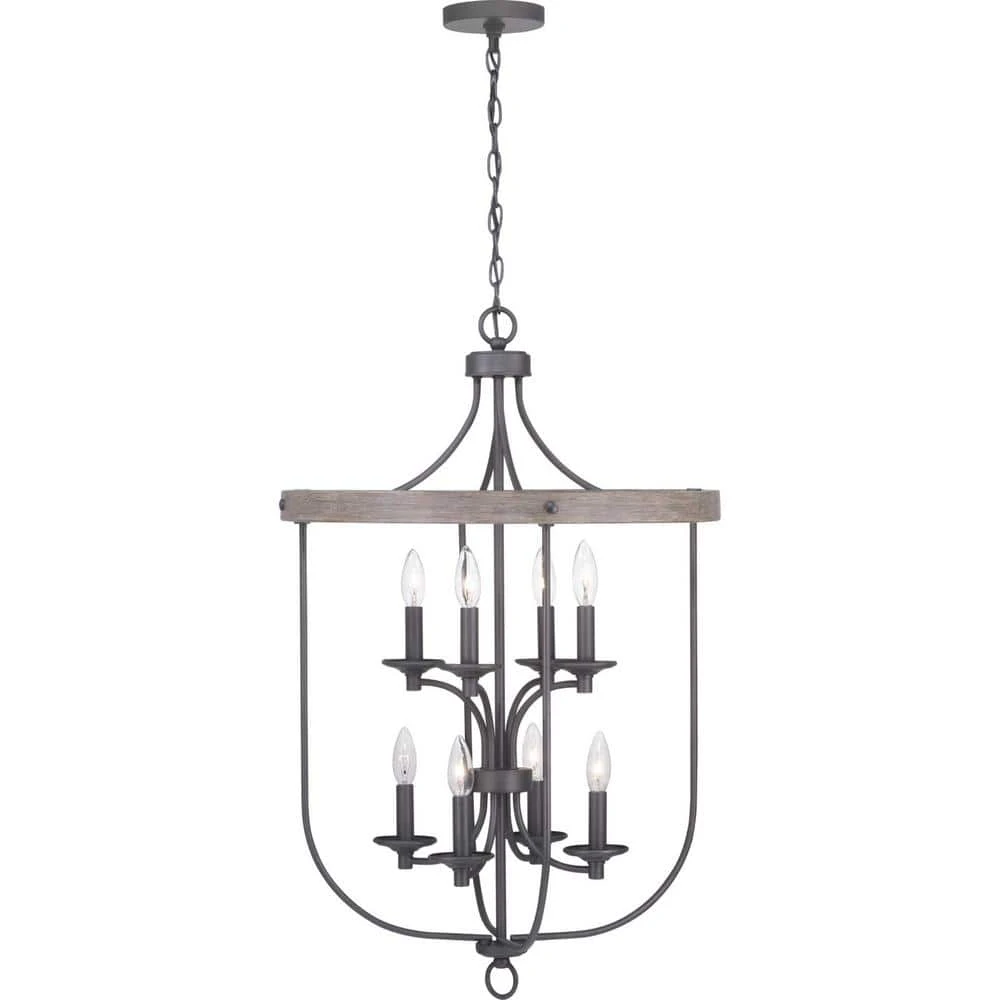 The 8-light foyer in the Gulliver Collection features arching and delicate details that curve to create an airy design. Dual toned frame color combinations in a Graphite finish with weathered oak accents. The hand painted wood grained texture complements Rustic and Modern Farmhouse home decor, as well as Urban Industrial and Coastal interior settings.