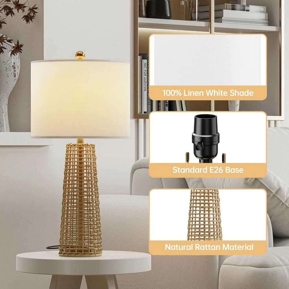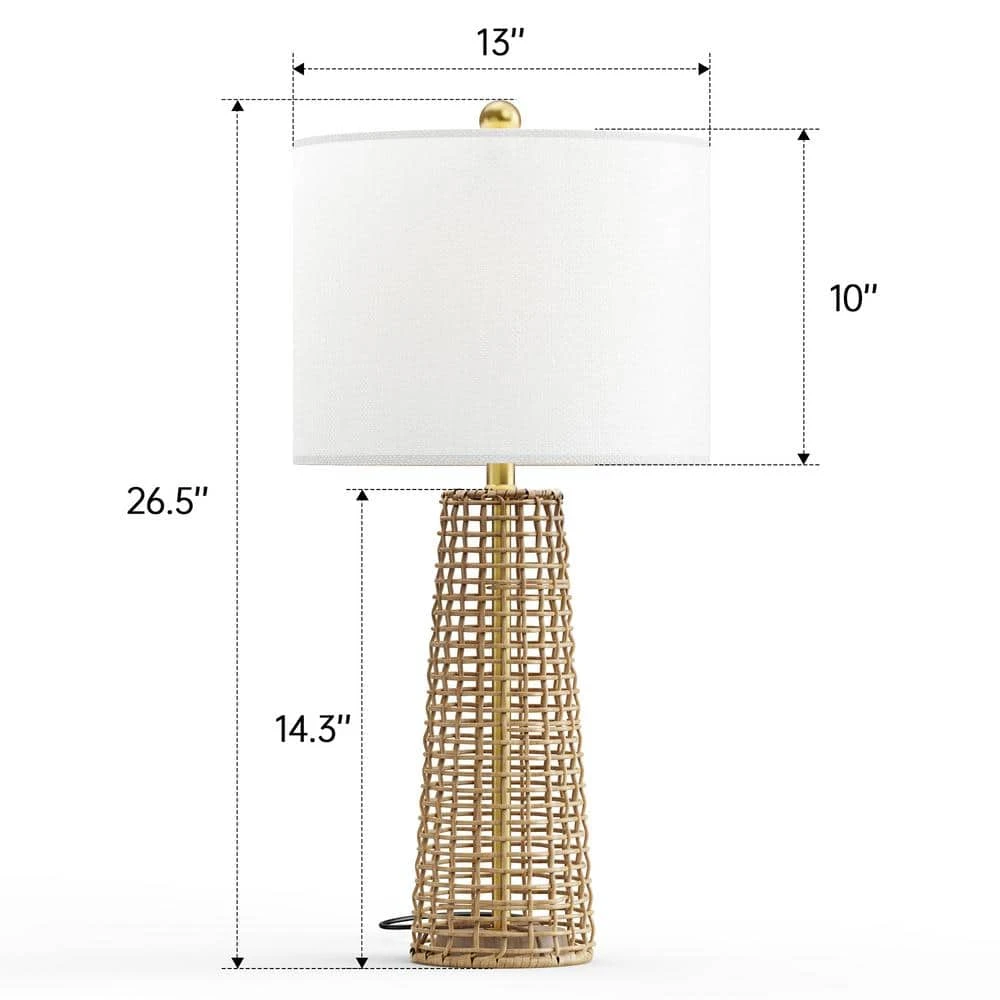 This is a pair of elegant table lamps with woven texture, combining natural wood aesthetics with metallic details for a perfect blend of modern and vintage style. The lampshade is made of soft white fabric, providing warm lighting to create a cozy atmosphere. Equipped with dimmable functionality, it requires compatible dimmable bulbs. Includes a 1-year manufacturer warranty and is ETL certified.