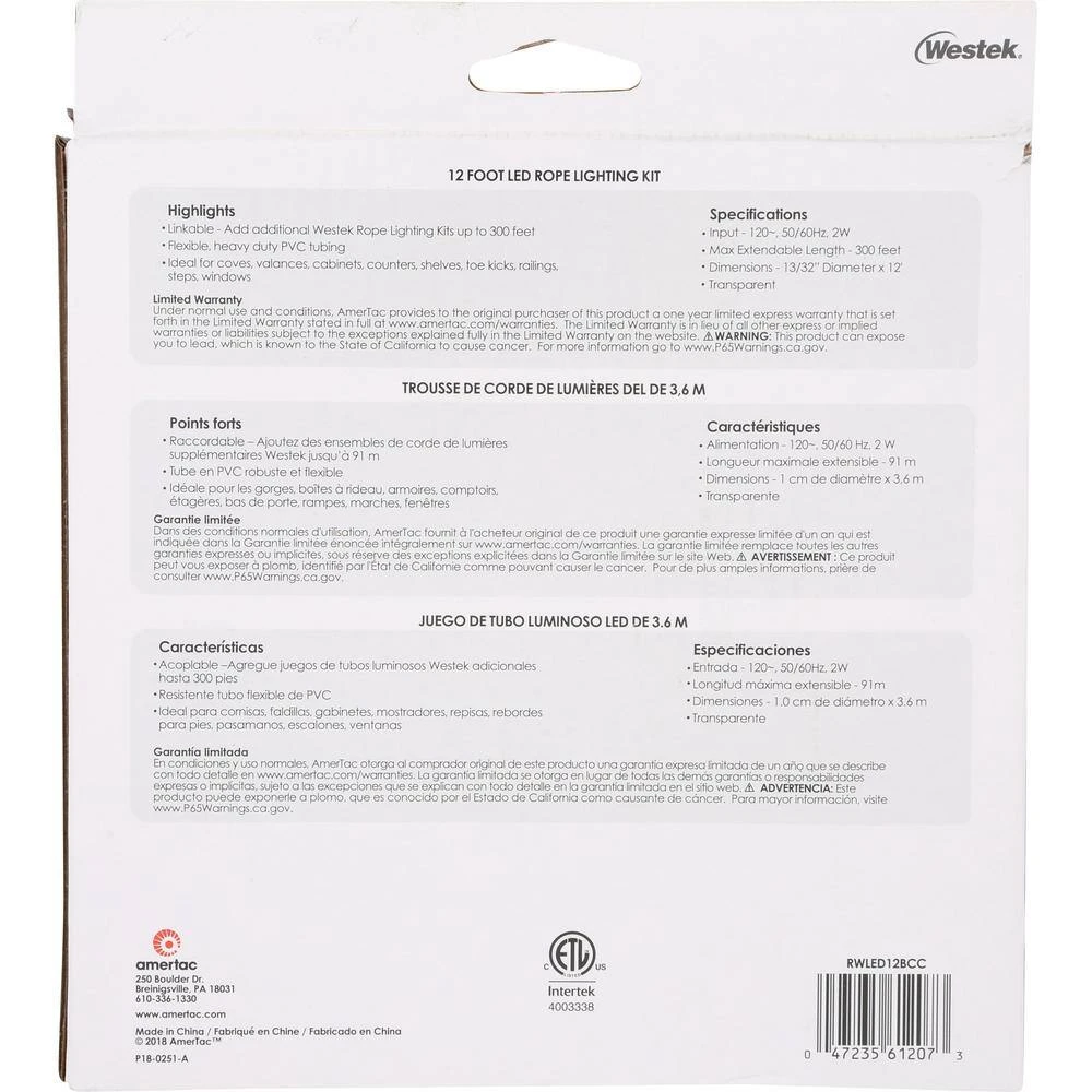 The Westek Indoor/Outdoor LED Rope Lights feature flexible, heavy duty, UV inhibiting PVC tubing that resists yellowing and cracking. Available in 6 ft., 12 ft., 24 ft. and 48 ft. lengths, the energy efficient LED rope lights use about 80% less energy than their incandescent cousins. Connect additional kits for up to 300 ft. of continuous light, enough to line a football field Perfect for inside homes to line steps, bottom or top of cabinets, valances, sliding doors, windows or entertainment center. Commonly used outdoors to outline decks, patios, pathways, stairs.