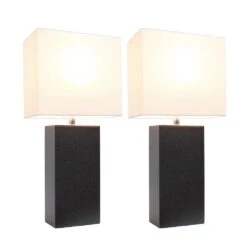 21 In. Modern Black Leather Table Lamps With White Fabric Shades (2-Pack)