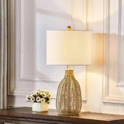 Heideman 22 In. Beige Modern Rattan Bedroom Living Room Bedside Desk Nightstand Table Lamps USB Port