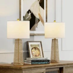 Heideman 26.5 In. Beige Modern Dimmable Rattan Bedroom Living Room Bedside Desk Table Lamps Set Of 2