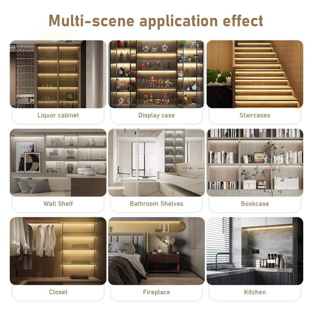 The package contains everything you need: AC110V to DC12V high efficiency power supply with 6 flexible output ports to meet your diverse lighting needs; Wired bulkhead hand sweep controller, with an ultra-sensitive detection distance of 2.5 cm, to achieve a light touch, long press dimming convenient operation, more powerful adhesive backing, accurate positioning, as you want to control the light and shadow in the home. Not only that, we are equipped with six 2-meter-long auxiliary cables to ensure a worry-free layout and easy connection to every detail. The highlight is the 2000 LED self-adhesive lamp strip, up to 400 LED beads per meter, 180° wide luminous surface, continuous, ultra-bright lighting, even the most hidden corners can be gently illuminated. The ultra-thin 5mm design, free cutting, free bending, and strong self-adhesive make installation easier and faster than ever before. Whether it is kitchen counters, bookshelves, closets, stair steps, gun safes, or even floating shelves, it can be instantly radiant in just a few minutes, using common household tools. Compared to the short and inconvenience of battery power, our electric light kits provide longer and more stable lighting performance, making them ideal for permanent installation. No longer limited by electricity, so that every place in the home is bathed in permanent light and shadow.