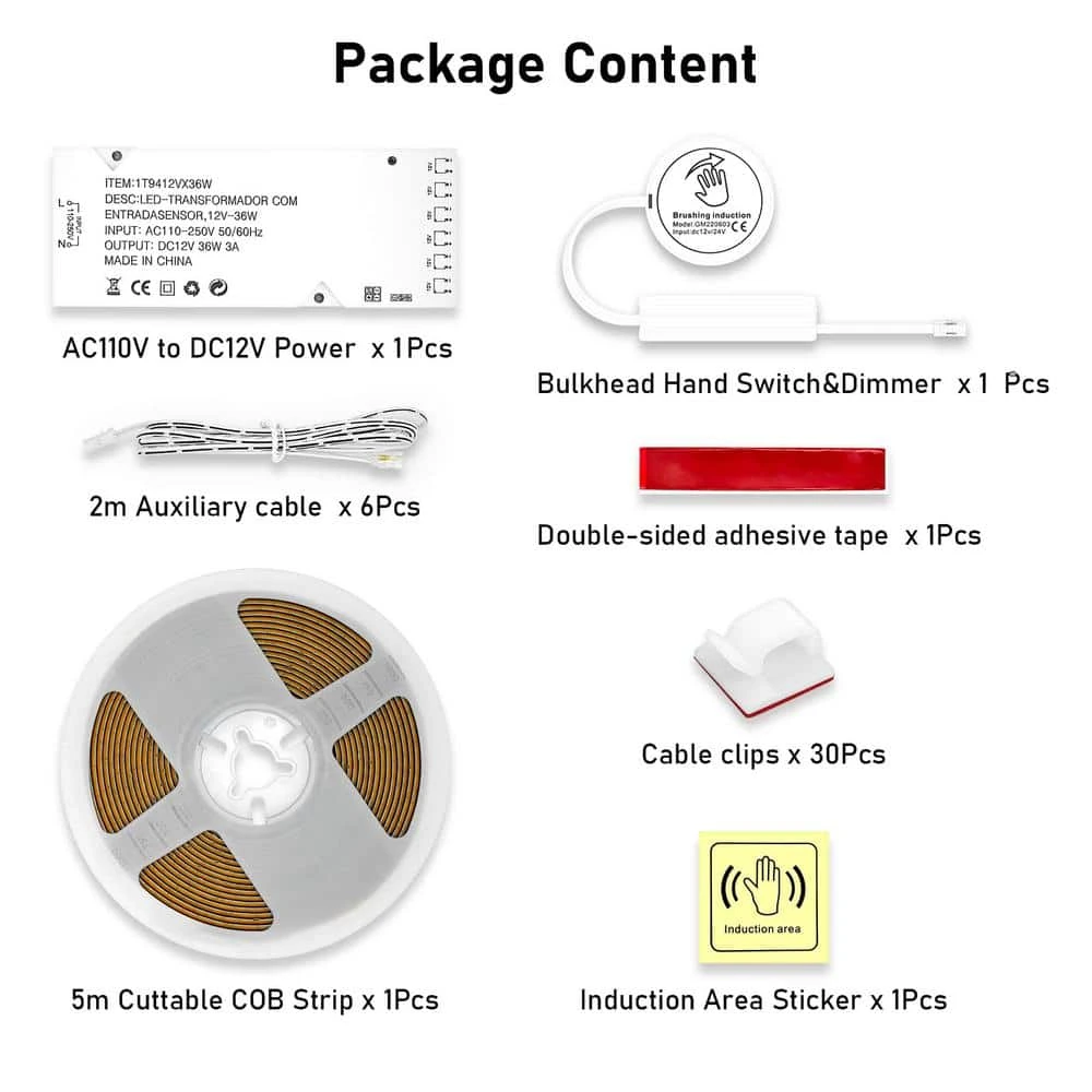 - Easy installation: package includes power supply, wired bulkhead hand sweep control (detection distance within 2.5cm), 6 auxiliary cables x 2m, 1 2000 LEDs self-adhesive strip (free cutting), mounting clip and tape, compared to other similar packages, we greatly optimize the ease of installation and application