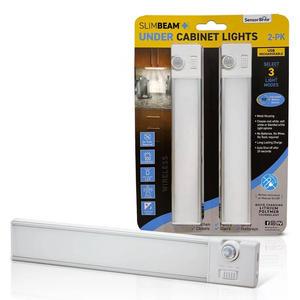 Slim Beam Under Cabinet Rechargeable- 2-Pack light bars gives you the right amount of light without complicated installation or wiring. Adjustable motion sensor allows you to customize the activation so they will come on automatically as you want. Select from 3-light modes, cool white, soft white, and blended white.