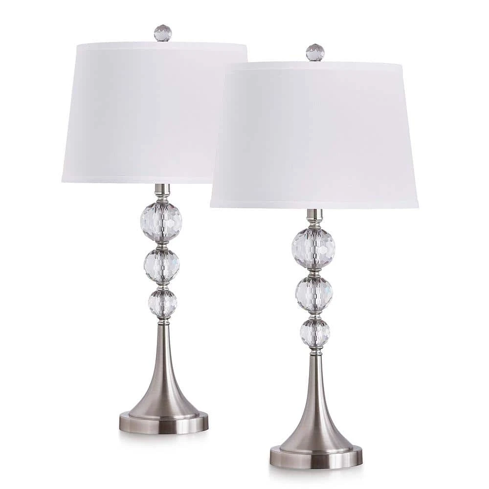 HOIMEGLAM design, the Madison lamp collection features 3 clear cut faceted crystal balls design. The 2-pieces table lamps set include two 26.5 in. H table lamps. The lamps are built with strong metal construction and steady weighted lamp base in brushed nickel or antique brass finish. The lights are controlled with socket rotary on/off switch with empire style white linen lamp shades. The Madison lamp collection from HOMEGLAM brings luxury and harmonize decor lights to your spaces.