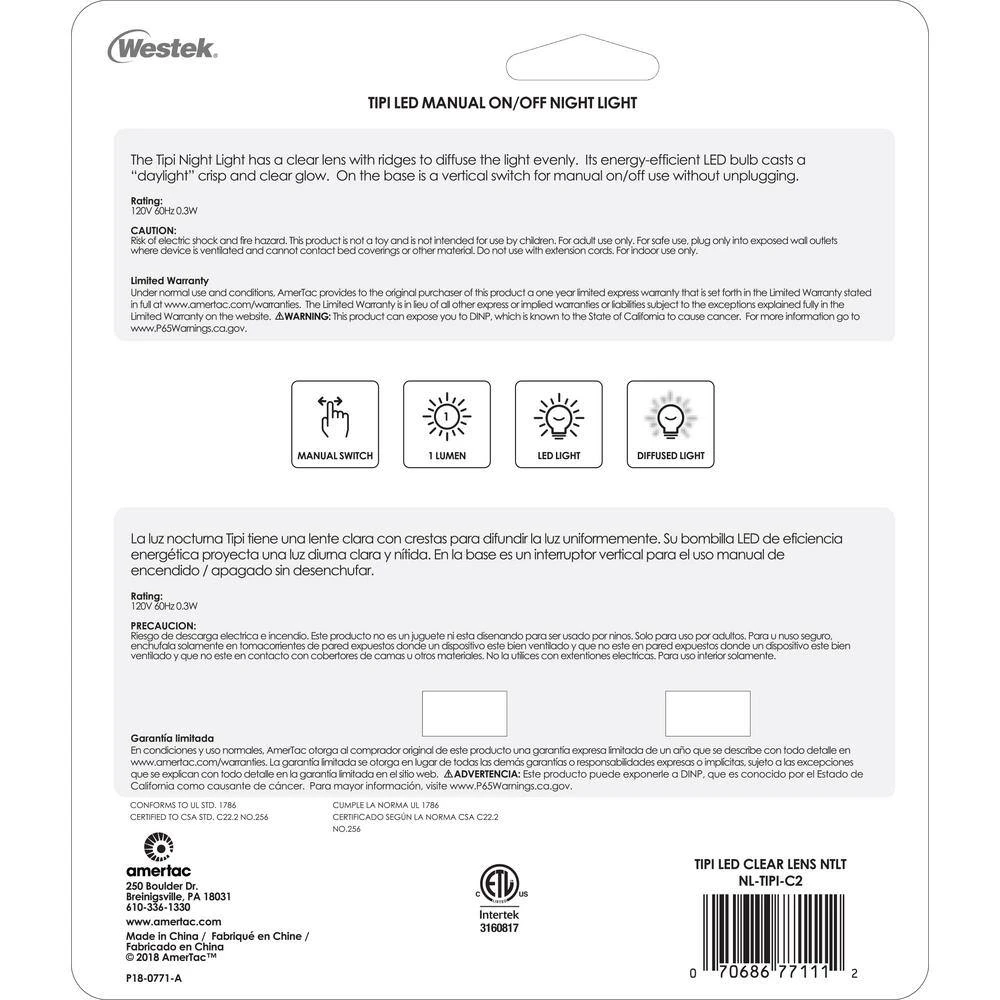 The Westek NL-TIPI-C2 Tipi Manual Switch Light is the perfect night time lighting solution. This device turns on with a convenient switch and gives off 1 lumen of vivid illumination through a clear lens; enough to see by without being obtrusive. Great for bedrooms, hallways, entryways, basements, bathrooms and more. Designed with a modern style that works with any decor. AmerTac manufacturing brands offer complete lines of distinctive decorative home accent products that include trend-setting wall plates, money saving LED night lights, innovative under cabinet lighting and LED battery operated lights. We also offer utility product lines including energy-saving timers, dimmers and lighting controls, as well as an extensive offering of consumer electronics accessories for the home and office.