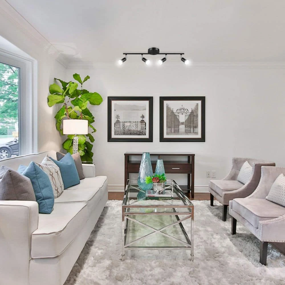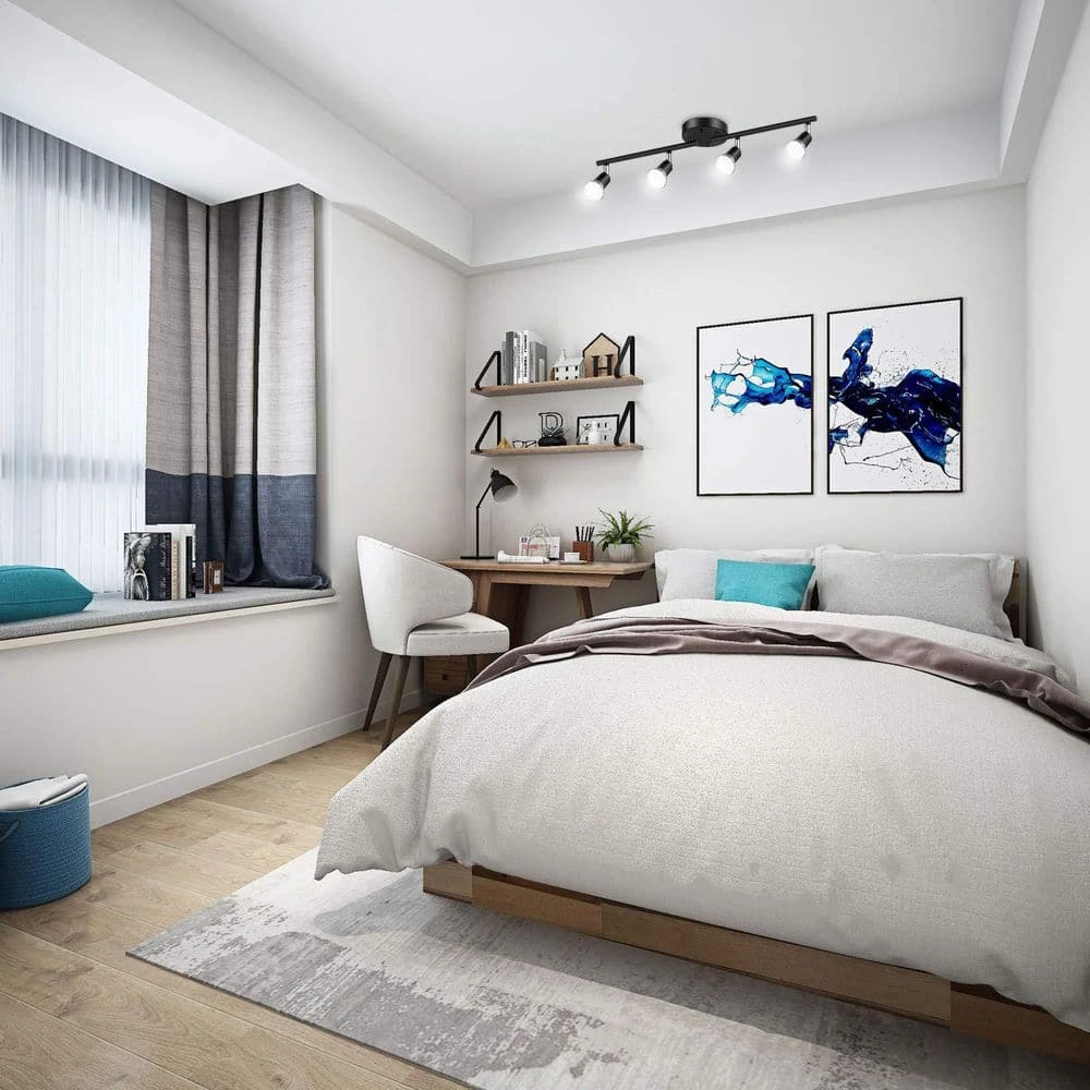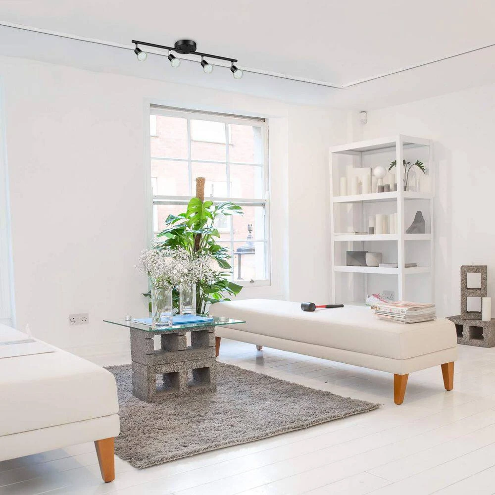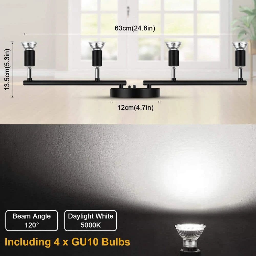 Elevate your home lighting with the modern and versatile 4-Light LED Track Lighting Kit in a sleek black finish. Designed with high-quality metal, this corrosion-resistant fixture adds a contemporary touch to any space while ensuring durability. Featuring four adjustable light heads, it offers customizable illumination with 360° horizontal and 90° vertical rotation, allowing you to highlight specific areas effortlessly. Included are four energy-saving 4W GU10 LED bulbs that provide 400 lumens of daylight white light (5000K), creating a bright and inviting atmosphere. This easy-to-install ceiling spotlight is compatible with sloped or vaulted ceilings, making it a practical and stylish addition to any room. Perfect for the bedroom, kitchen, dining area, or even a bar, it delivers focused, reliable lighting that sets the right ambiance for any occasion.