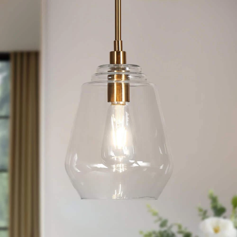 Combine modern, farmhouse, country, industrial, and other styles and designs into one cohesive design without losing harmony. Adopts an electroplated brass color finish with, a bell-shaped seeded glass shade, this chic pendant light is an ideal choice for decorating your home life. With the bulb (not included) lighted up, soft and warm light is spread through the clear glass shade, bringing the lighting while setting up a warm atmosphere. And its appropriate size is excellent whether it is used individually or combined in rows.