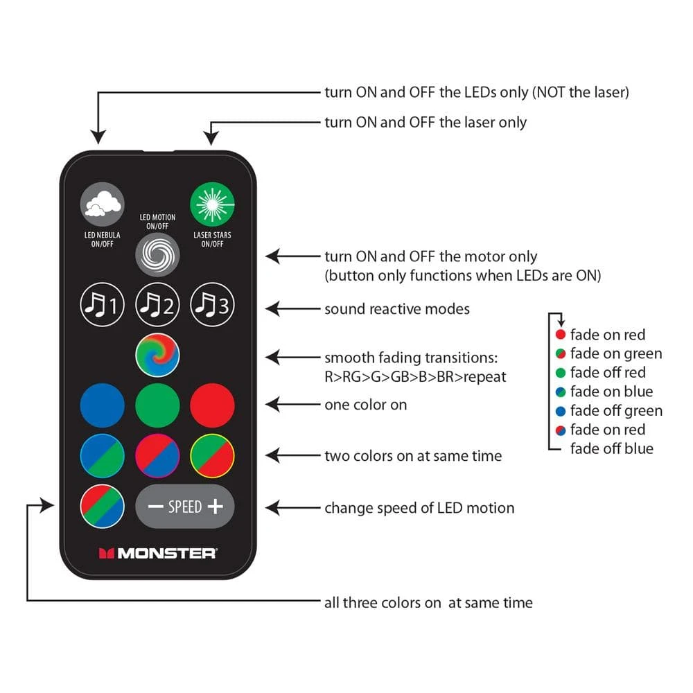 - Use the LED effects to the lasers, colors, sound and motion speed settings to best reflect what you want