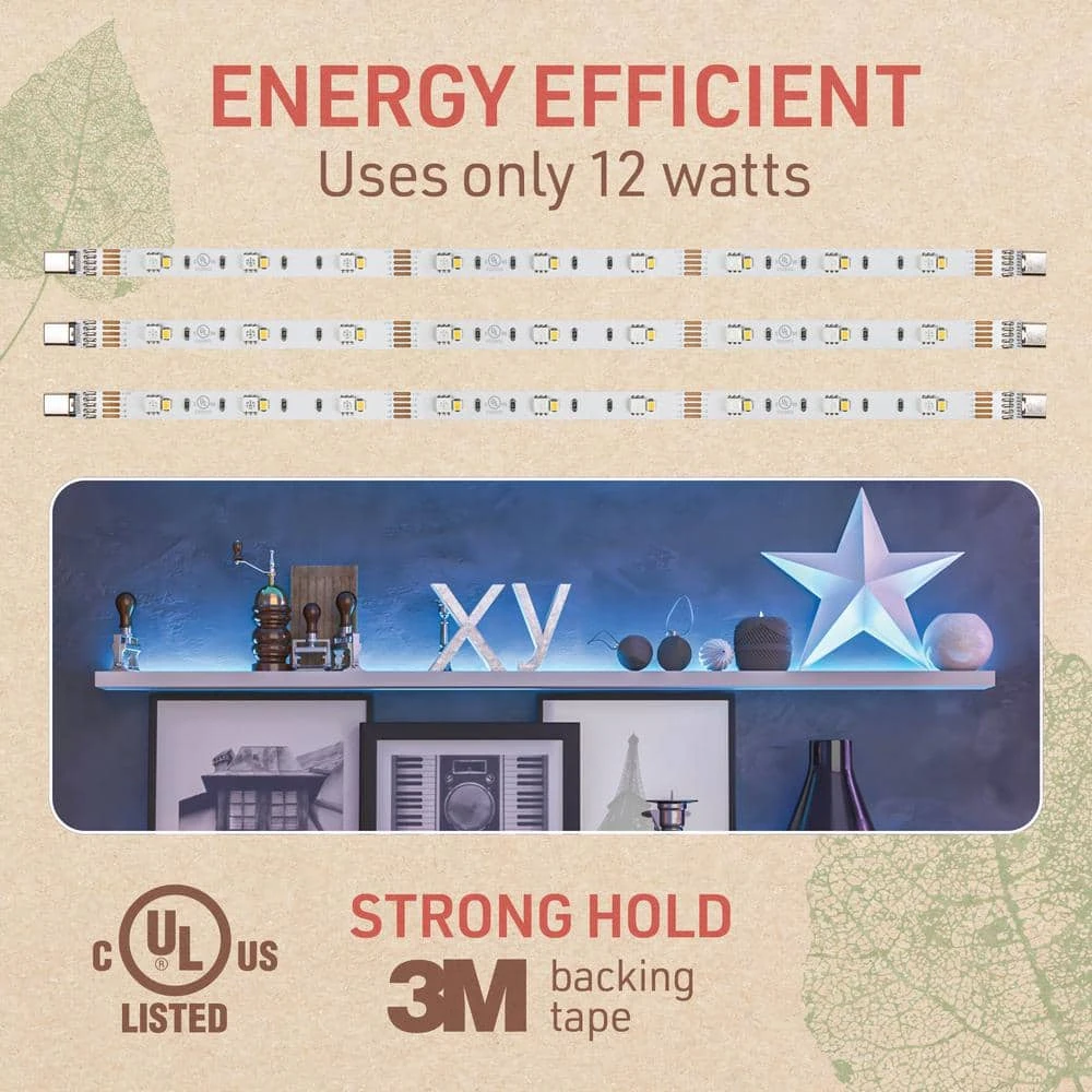 Enhance your surroundings with the Birch Harbor RGB+W Multicolor 12 in. LED Strip Light Kit. The versatile kit includes 36 total inches of dimmable, color changing LED tape light, in 3 separate 12 in. strips. Pre-cut strip lights are ideal for creating custom installations without the need to measure and cut longer component tape. The all-in-one tape light kit includes everything you need to plug and play right out of the box. Create dynamic, multicolored lighting displays with the included RF remote control. Radio frequency remote functionality allows you to control color output, brightness/dimming and lighting effects, even through walls and obstructions. Featuring quick-connect linkable connection points on all components that allow you to make secure connections between LED strips, easy-connect extension wires and power supply without the need to observe polarity. It’s easy to make secure connections between LED strips, extension wires and power supply to customize the length of your installation and make turns or jumps around obstacles. The flexible 12 in. strips can be cut to size to fit your unique application. Ultra-thin, flexible tape light can be hidden in installations for a sleek, professional look. Its easy to seamlessly integrate LED lighting into various applications to enhance functionality and create a lively ambiance. Ideal for TV backlighting, PC game lighting, showcase display lighting and fun under cabinet lighting.