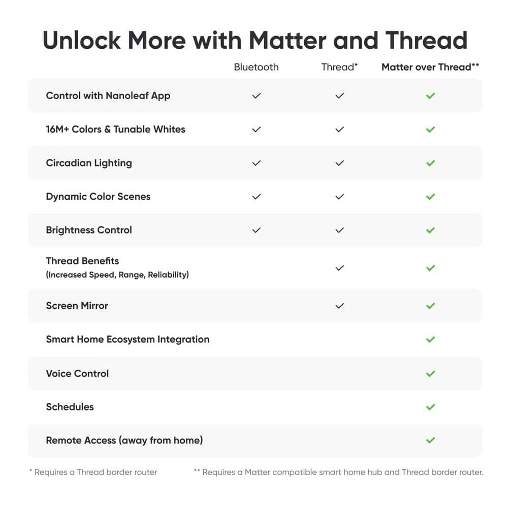 - Matter & Thread Enabled, Matter allows compatibility with major smart home ecosystems like Apple Home, Google Home, Amazon Alexa and Samsung SmartThings. To use Matter and connect to a smart home ecosystem, a Matter compatible hub, thread border router and iOS/tvOS 16.5+ or Android OS 8.1+ is required.