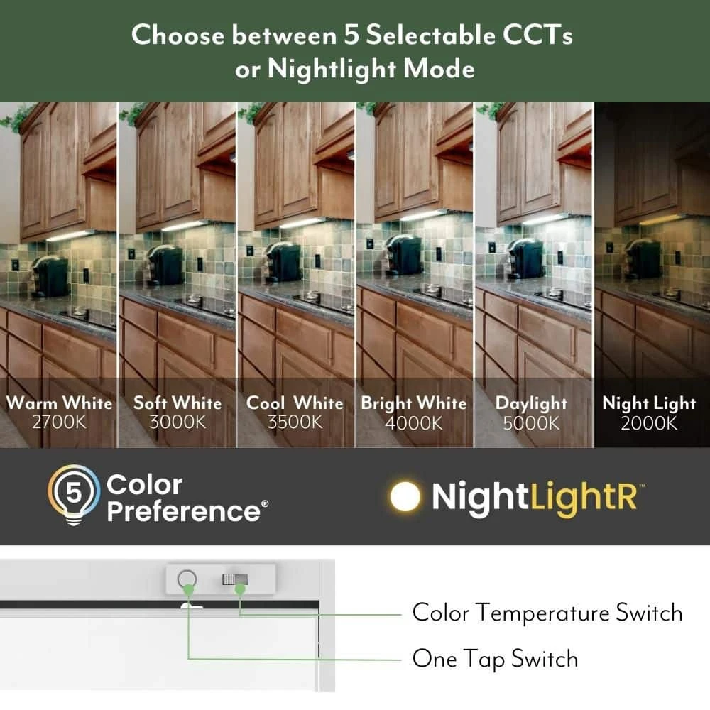 Directional Lighting with Nightlight & OneTouch Control – Illuminate your space with the ETI Nexus Adjustable LED Under Cabinet Light, designed for ultimate flexibility and performance. The adjustable lens tilts 55° for precise lighting direction, while the five Color Preference settings let you switch between color temperatures ranging from Warm White to Daylight – allowing you to tailor the lighting to your desired ambiance and mood. Activate the NightLightR mode to emit a soft Amber glow creating a warm and inviting atmosphere – perfect for evenings or when returning home. The One Touch control allows you to control power and nightlight feature for all linked fixtures by pressing a summary on one fixture. Ideal for upgrading any under-cabinet space, this plug-in fixture includes a linking cable and mounting hardware for versatile installation. The Nexus under cabinet light is energy-efficient, combining flexibility, convenience, and modern style.