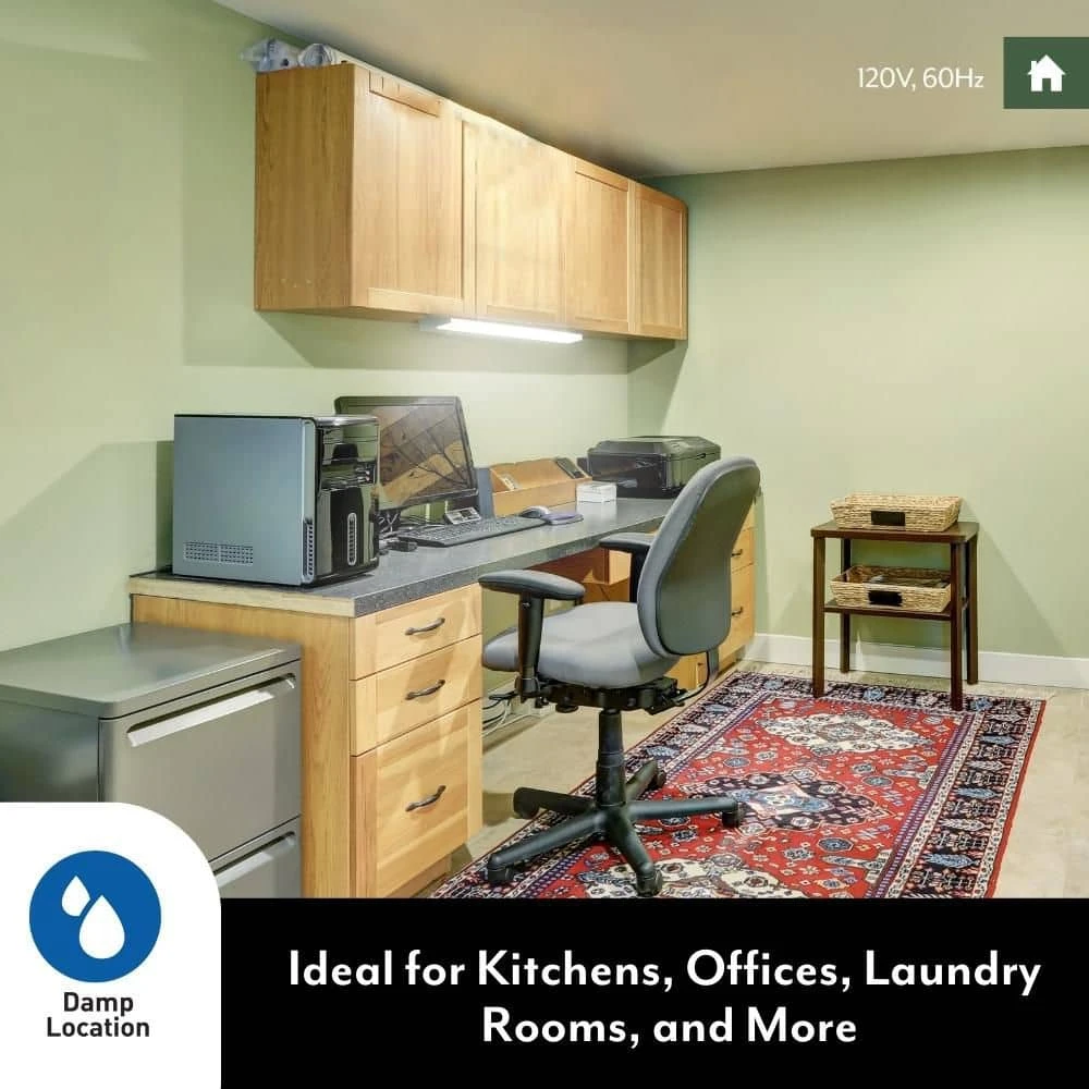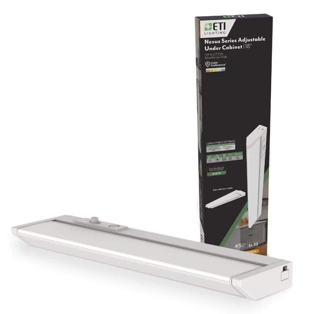 ETI Lighting’s Nexus 18in. Plug-in LED Under Cabinet Light with an adjustable angled lens is a versatile lighting solution for kitchens, workspaces, or any area in need of extra illumination. Its advanced design and innovative features enhance both functionality and aesthetics. Choose from five customizable Color Preference settings, ranging from Warm White to Daylight, to match your mood or task. The adjustable lens tilts inward and outward, allowing you to direct light exactly where you need it. Perfect for upgrading any under-cabinet space, this plug-in fixture includes linking cables and mounting hardware for quick installation. The Nexus Under Cabinet Light is energy-efficient, offering an ideal blend of flexibility, convenience, and style.