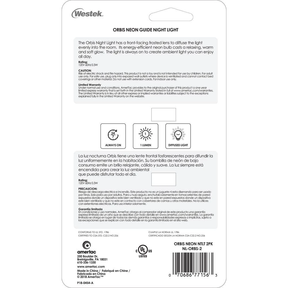 Westek NL-ORBS-2 Orbis Neon Guide Lights are perfect in as path lights or in entryways, bathrooms, hallways, or any area where you need light. The 1 lumen neon lights add safety and security to any space. Frosted glass provides a comforting, unobtrusive glow. AmerTac manufacturing brands offer complete lines of distinctive decorative home accent products that include trend-setting wall plates, money saving LED night lights, innovative under cabinet lighting and LED battery operated lights. We also offer utility product lines including energy-saving timers, dimmers and lighting controls, as well as an extensive offering of consumer electronics accessories for the home and office.
