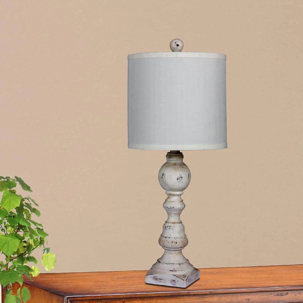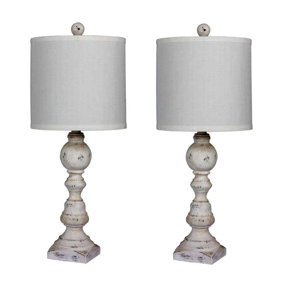 2 luxury lamps without the luxury price. Fangio Lighting’s #6241CAW-2PK Pair of 26 in. Resin Table Lamps in a Cottage Antique White finish will instantly add a charming vintage feel to any room. Attention to detail can be found in the intriguing, Distressed Balustrade design that will add a subtle rustic flare to your favorite space. The Cottage Antique White finish is fresh and new, made specifically to wonderfully compliment the trending color pallets found in homes today. Lamps includes designer shades made in a decor friendly hue of White. Each light comes complete with an easy to use On/Off switch and takes 1 bulb with a maximum wattage of 100 (Not Included.) Lamp set is UL and CSA Listed. Showcase your brilliant tastes by adding a warm cottage flare to your space. If you enjoy the welcoming lines of classic designs updated with a striking finish, this is the lamp collection for you. Bring this set home. You will be glad you did.