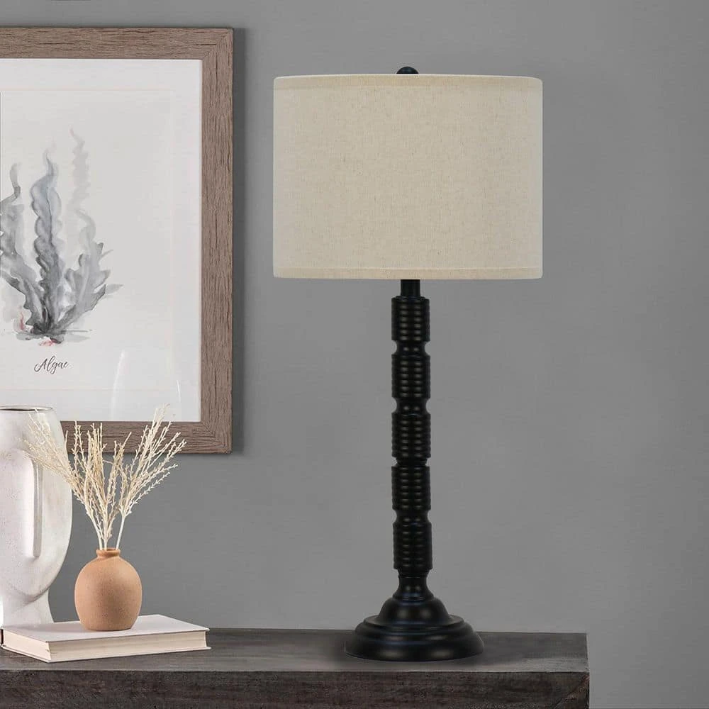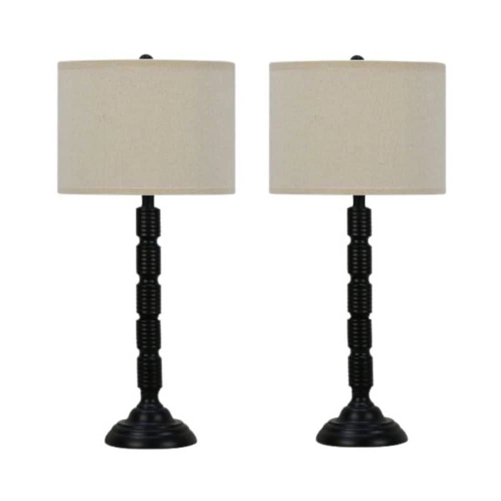 Fangio Lighting’s #1562BLK-2PK pair of 30.25 in. satin black metal table lamps are sure to stand out with their unique ribbed look. Attention to detail can be found in the industrial inspired, ribbed design that instantly adds a contemporary flare to your favorite room while the slim form allows for a larger sense of space in its environment. The satin black finish is among the most desired in homes today. Lamps include designer shades made of decor friendly oatmeal linen. Lamp comes complete with an easy to use 3-way switch. This item takes 1 bulb with a maximum wattage of 150(Not Included). Lamp is UL and CSA Listed. Showcase your bold tastes wonderfully with this fresh, new style. This stylized, industrial ribbed lamp possesses its own presence while illuminating your exquisite decorating tastes. If you enjoy the impressive lines of transitional or industrial designs, this is the lamp for you. Bring this item home. You will be glad you did.
