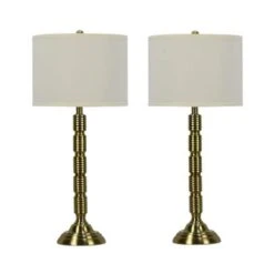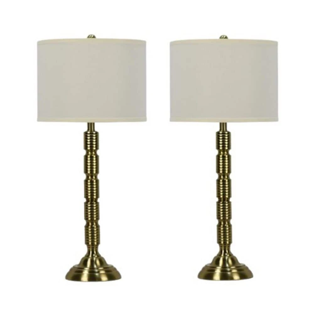 Fangio Lighting’s #1562SG-2PK pair of 30.25 in. soft gold metal table lamps are sure to stand out with their unique ribbed look. Attention to detail can be found in the industrial inspired, ribbed design that instantly adds a contemporary flare to your favorite room while the slim form allows for a larger sense of space in its environment. The soft gold finish is among the most desired in homes today. Lamps include designer shades made of decor friendly cream linen. Lamps come complete with an easy to use 3-way switch. These lamps take 1 bulb with a maximum wattage of 150(Not Included). Lamp is UL and CSA Listed. Showcase your bold tastes wonderfully with this fresh, new style. These stylized, industrial ribbed lamps possesses their own presence while illuminating your exquisite decorating tastes. If you enjoy the impressive lines of transitional or industrial designs, these lamps are for you. Bring this item home. You will be glad you did.