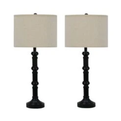 Fangio Lighting’s 1596BLK-2PK pair of 30.75 in. satin black metal stacked candlestick table lamps are sure to instantly charm. Attention to detail can be found in the striking look and stunning design that will add a subtle contemporary flare to your favorite space. The satin black finish is among the most desired in homes today. Lamps include designer shades made of decor friendly oatmeal linen. Lamps come complete with an easy to use 3-way switch. These lamps takes1 bulb with a maximum wattage of 150 (Not Included). Lamp is UL and CSA Listed. Showcase your discerning tastes brilliantly with this item. The stylized, stacked candlestick look possesses its own presence while illuminating your exquisite decorating tastes. If you enjoy the graceful lines of transitional designs, these are the lamps for you. Bring this item home. You will be glad you did.