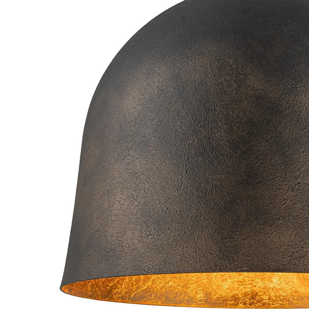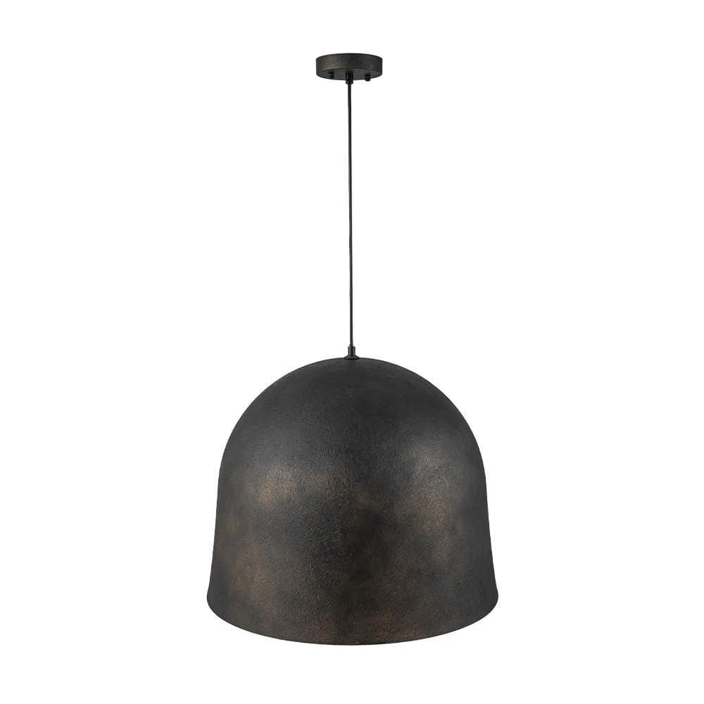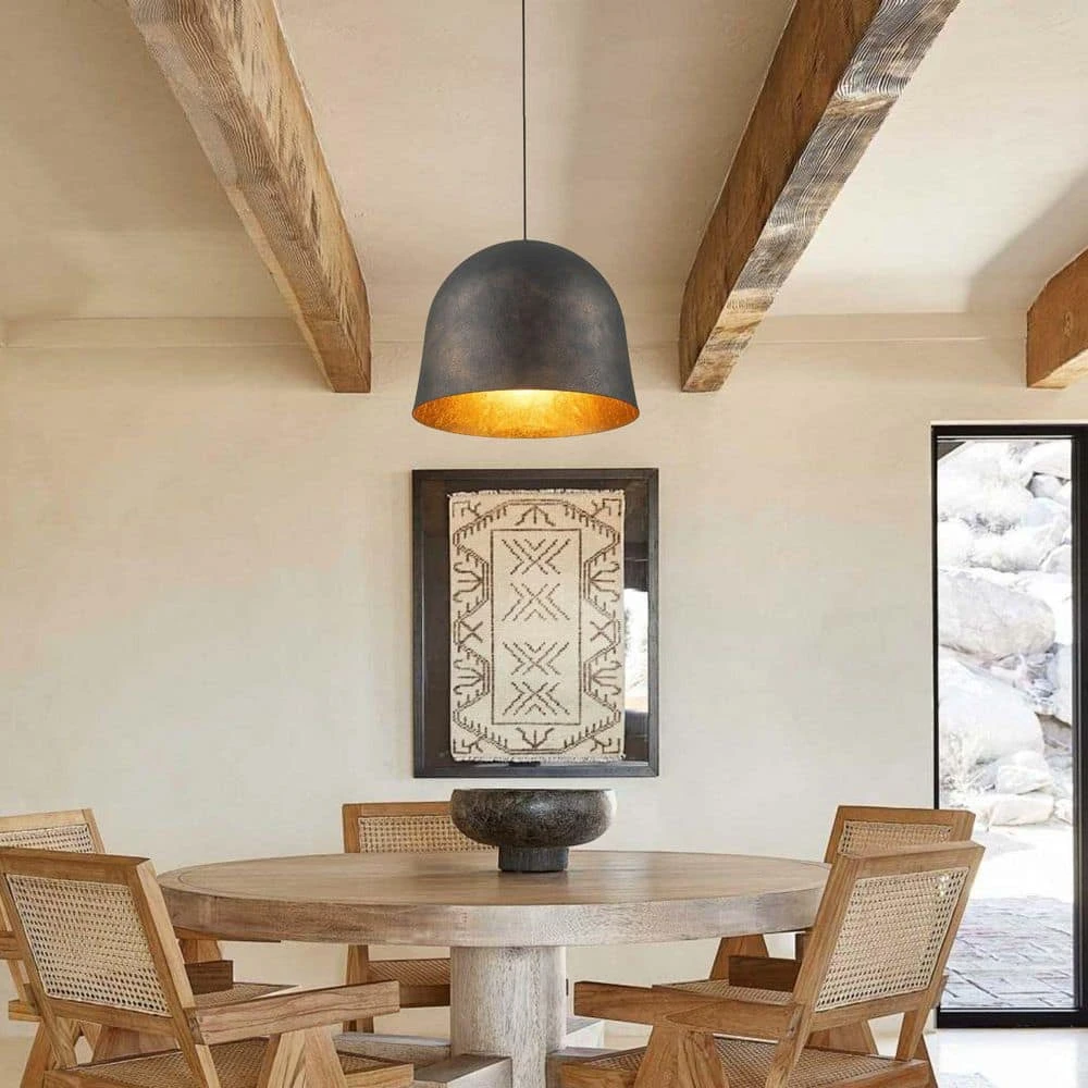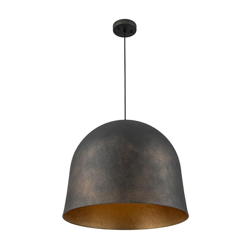 Rugged and refined, this 21.7-inch bell-shaped pendant light features an antique black finish with subtle golden undertones and a radiant gold foil interior that creates a warm, inviting glow. The oversized dome design brings a bold industrial statement to any space, while the distressed texture adds vintage farmhouse character. Ideal for kitchens, dining rooms, and vanities, this fixture offers sculptural appeal and ambient lighting with timeless charm.