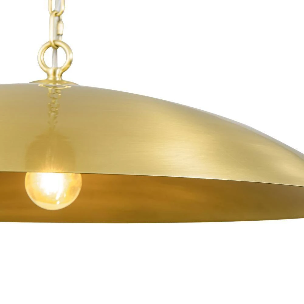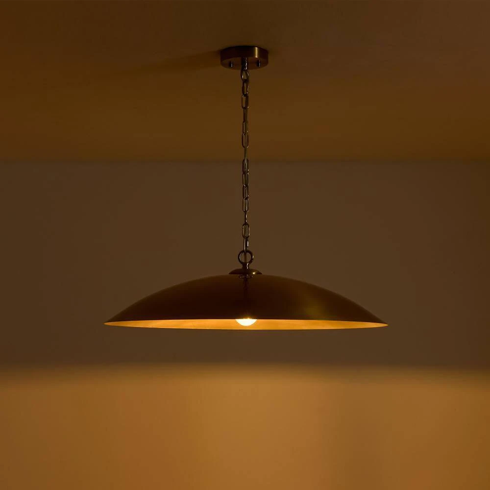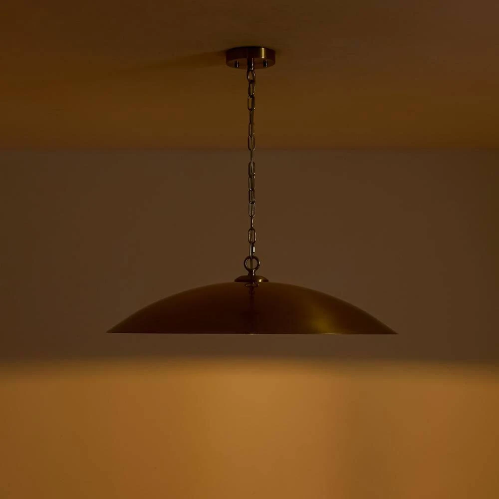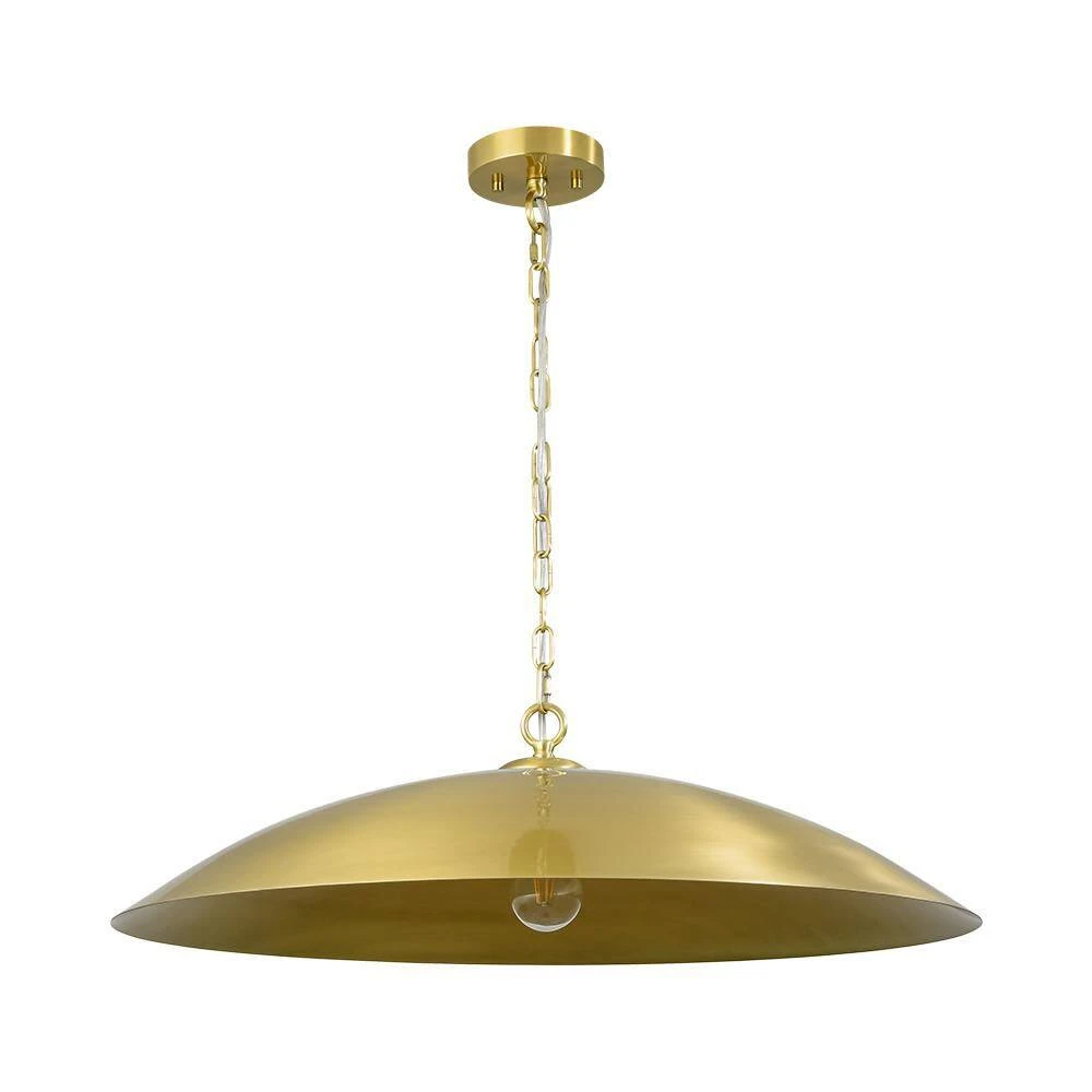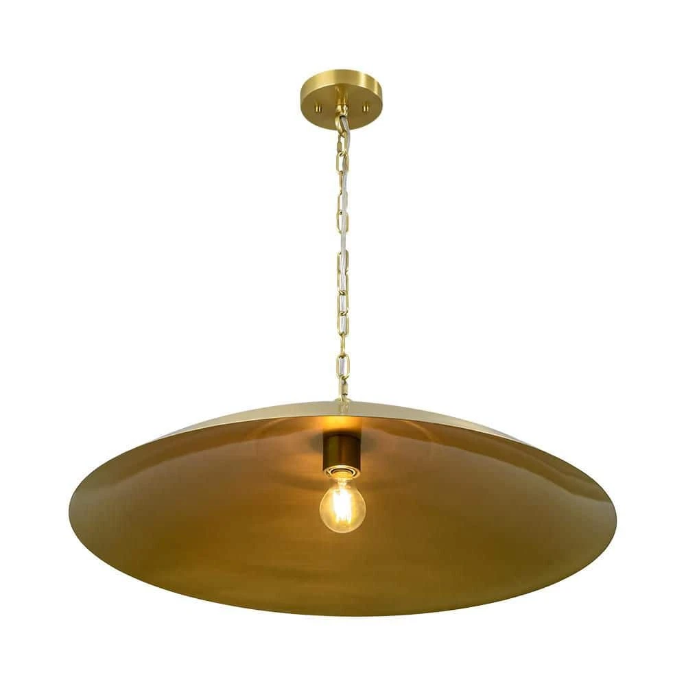 Make a bold statement with this striking 1-light pendant, crafted in a wide disc shape that evokes the sleek profile of a flying saucer. Finished in aged brass, the metal dome shade radiates timeless elegance while offering a warm, focused glow. Perfect for use over a kitchen island, dining table, or entryway, this pendant combines modern minimalism with a hint of vintage character.