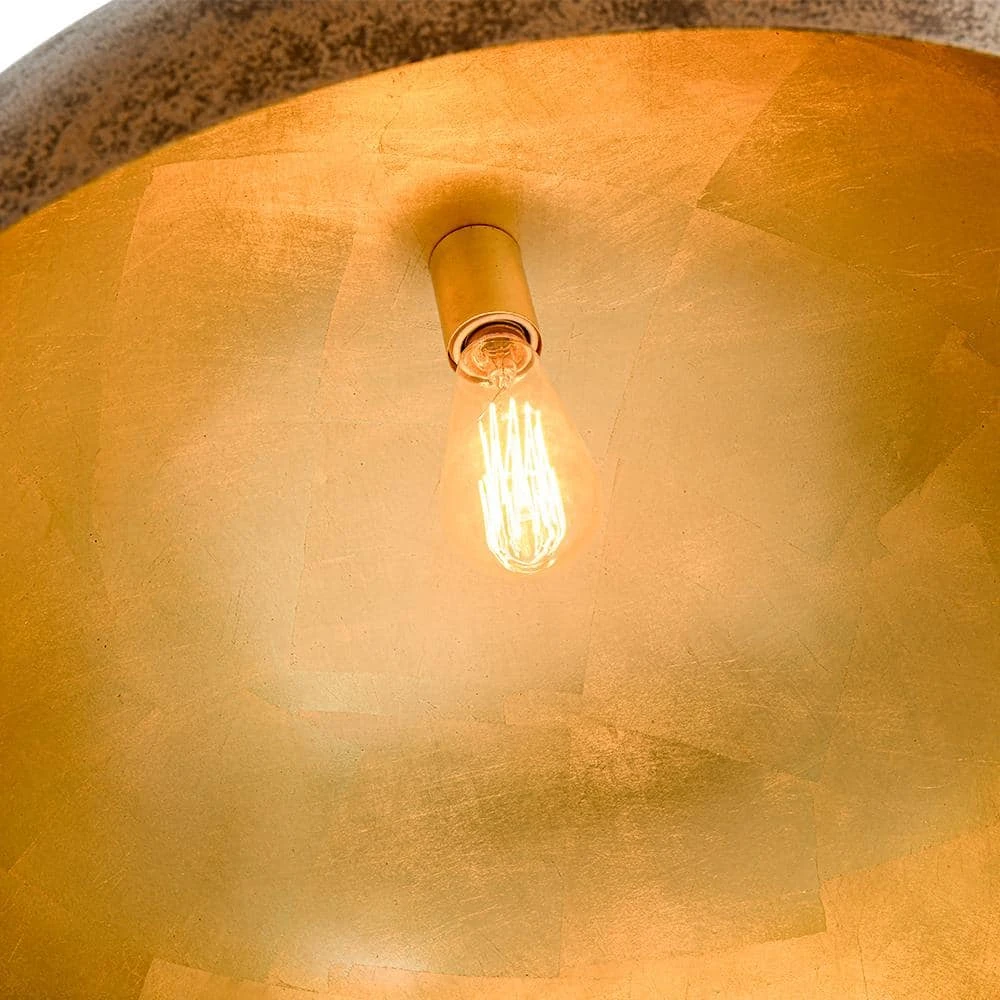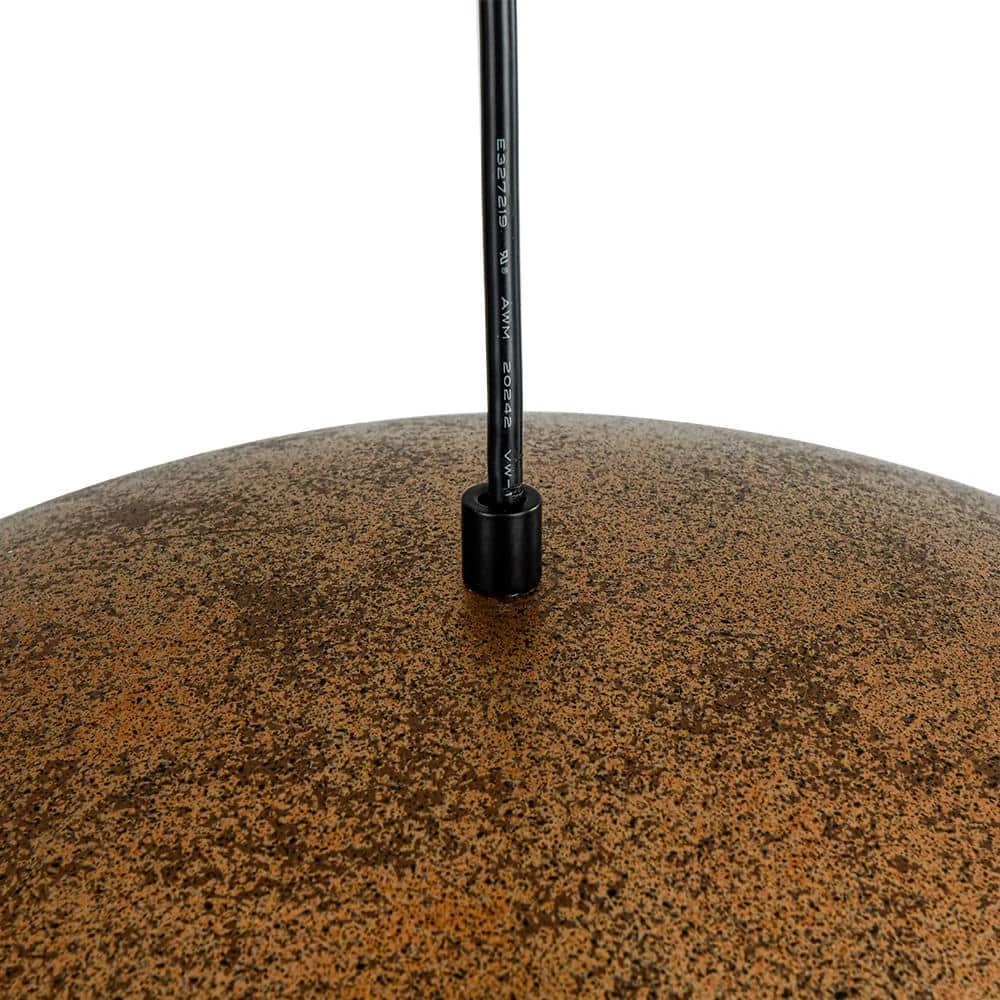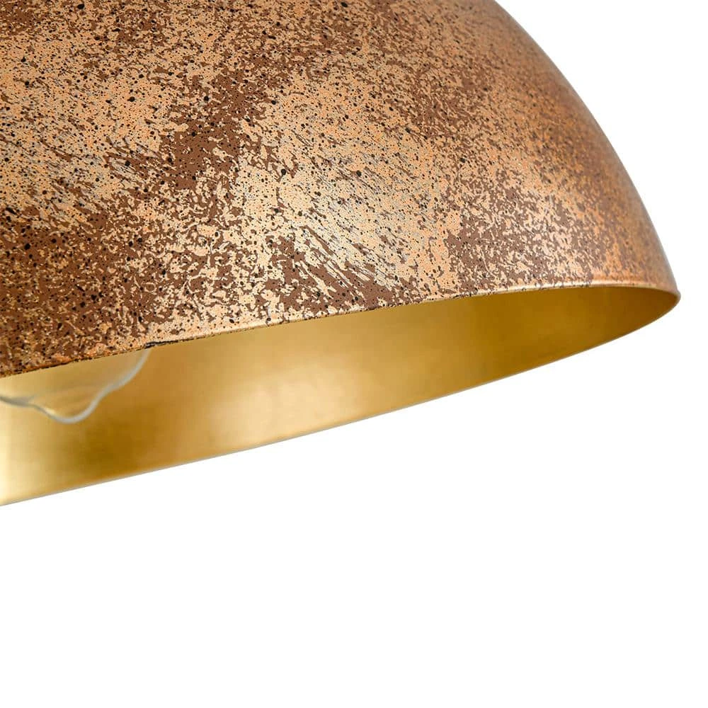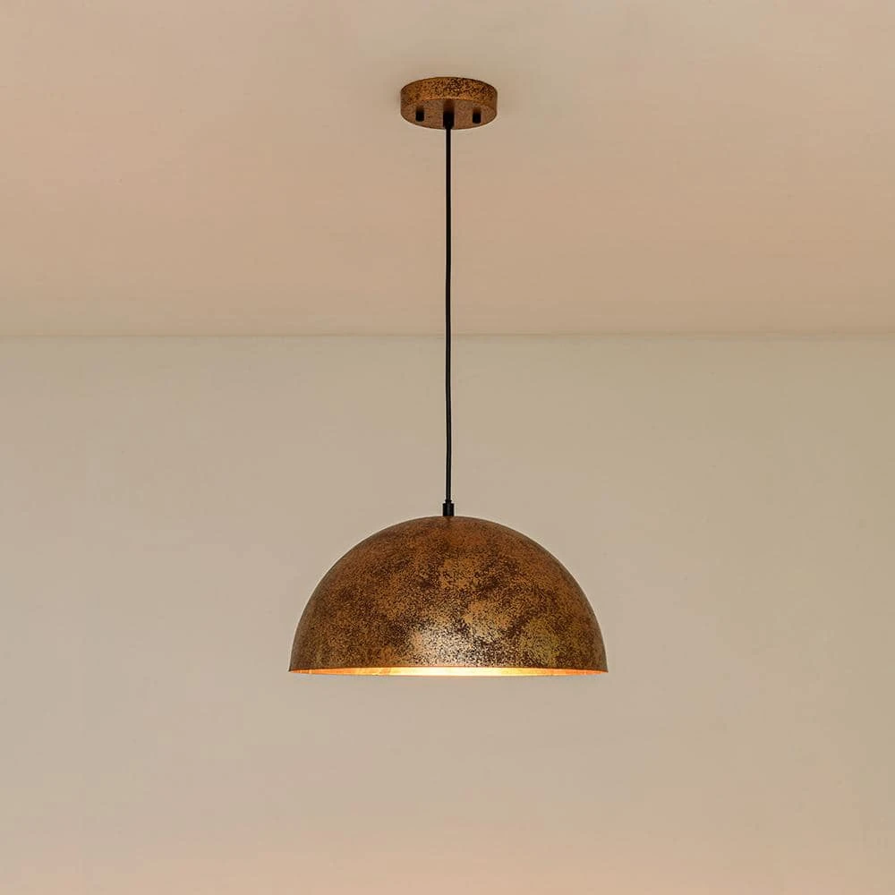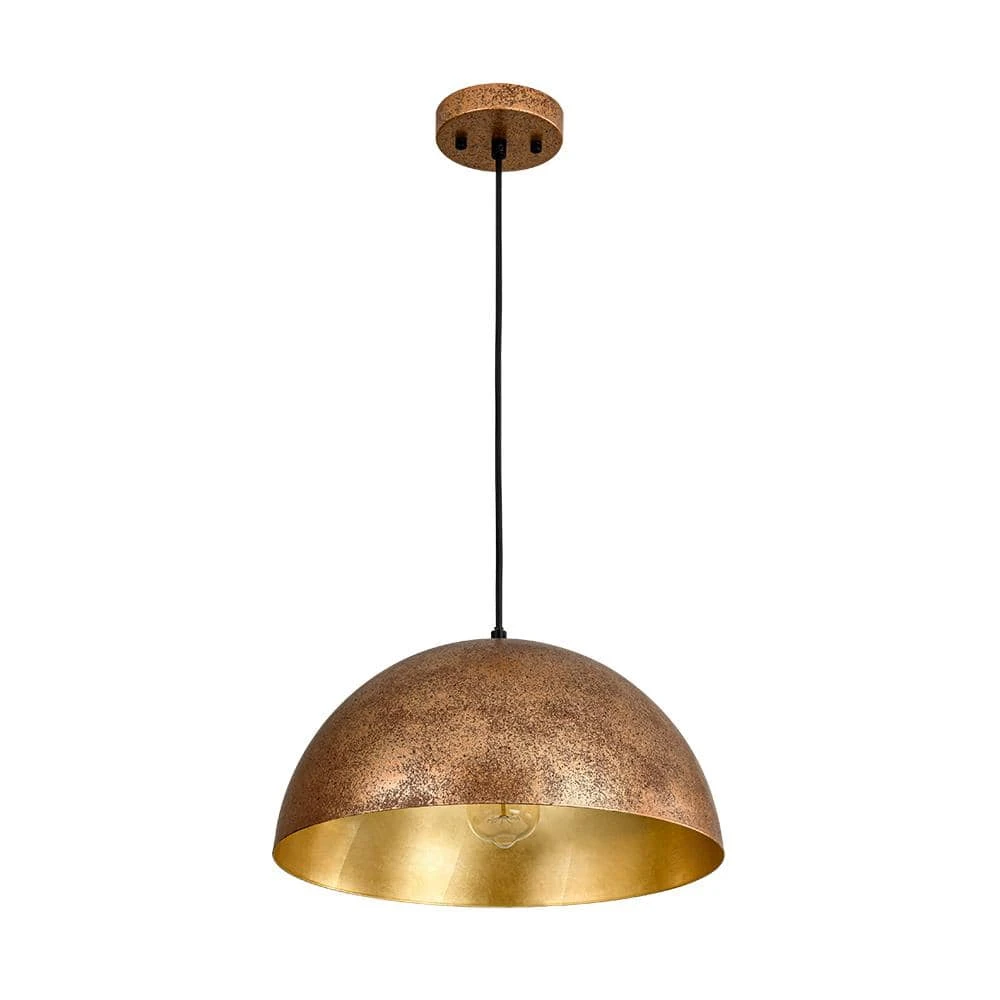 Add a touch of industrial elegance to your home with this 15 in. Dia dome pendant light, featuring a weathered rust finish on the exterior and a luxurious hand-applied gold leaf interior. This versatile light fixture is perfect for a range of settings, from industrial-style lofts to rustic farmhouse kitchens. Its vintage, distressed look is enhanced by the dome shape, making it a standout piece for dining rooms, entryways, and living spaces. With an E26 bulb base and a maximum wattage of 60-Watt, this pendant light provides both style and functionality. The black suspension cable is adjustable up to 86.6 in. (7.2 ft.), allowing flexibility for various ceiling heights.