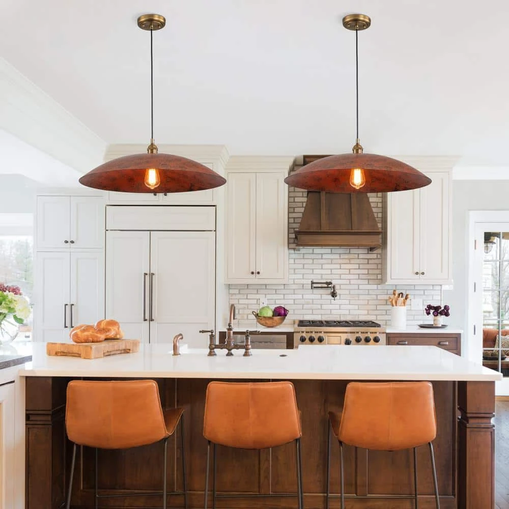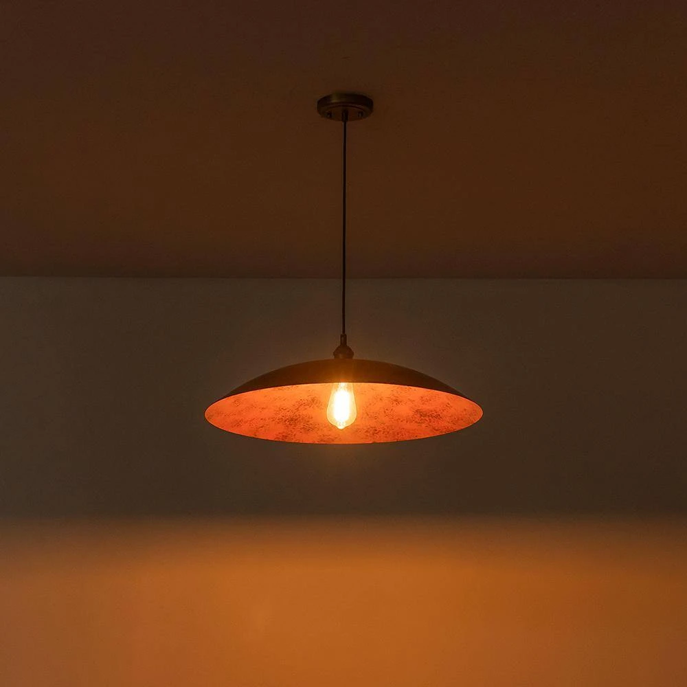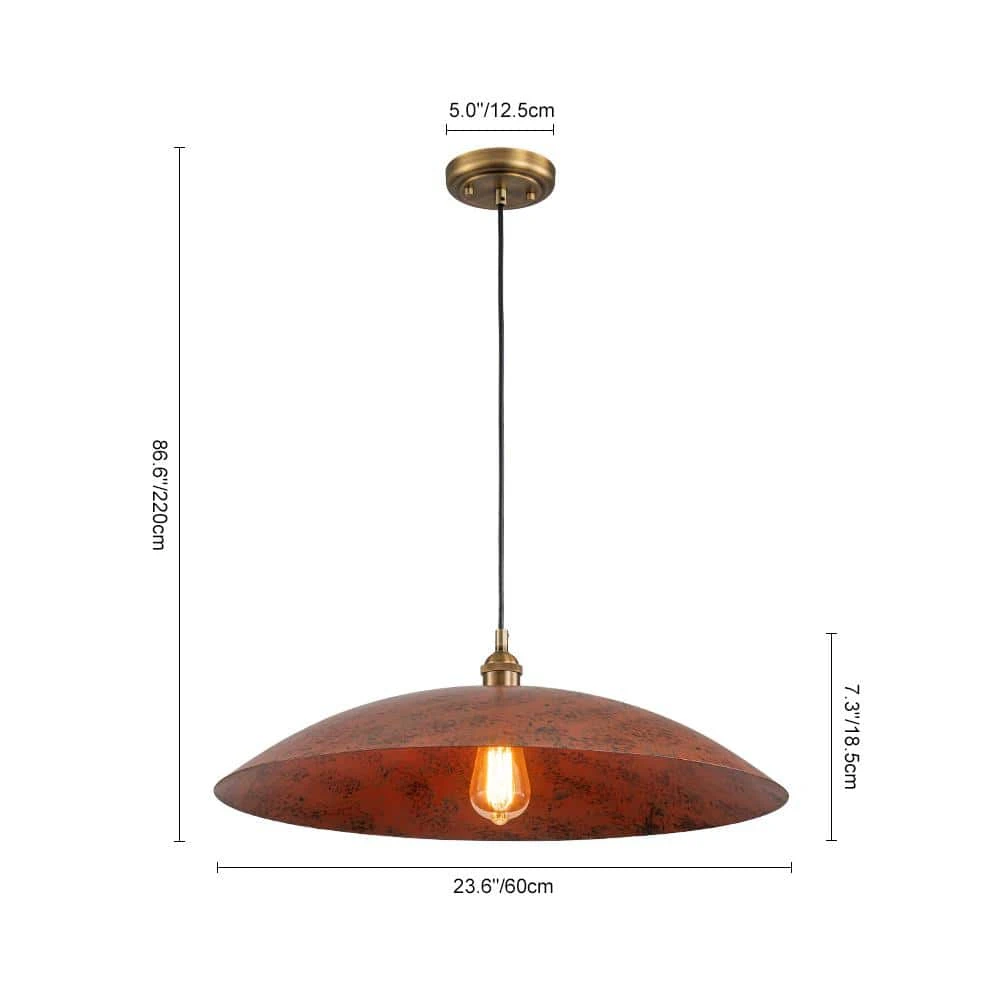 Inspired by UFO designs, the HUOKU 1-Light Distressed Copper Pendant Light offers a blend of vintage charm and modern functionality. Perfect for industrial farmhouse kitchens, dining areas or rustic living rooms, this pendant features a 23.6 in. Dia shade with a conical dome and a handcrafted distressed copper finish. The central brass accent on the shade adds a touch of sophistication. With a 78.7 in. adjustable cord, this light allows for flexible hanging lengths to fit various ceiling heights. Its distinctive design and versatile features make it an excellent choice for adding both style and illumination to any space.