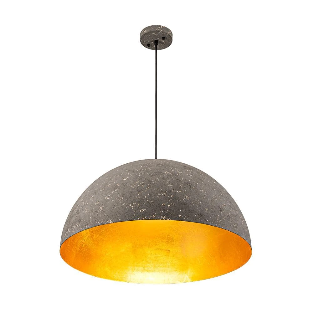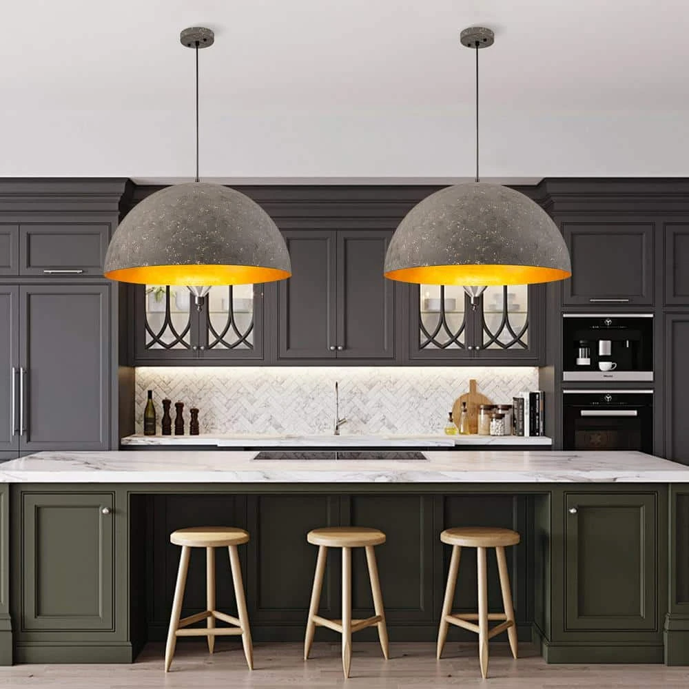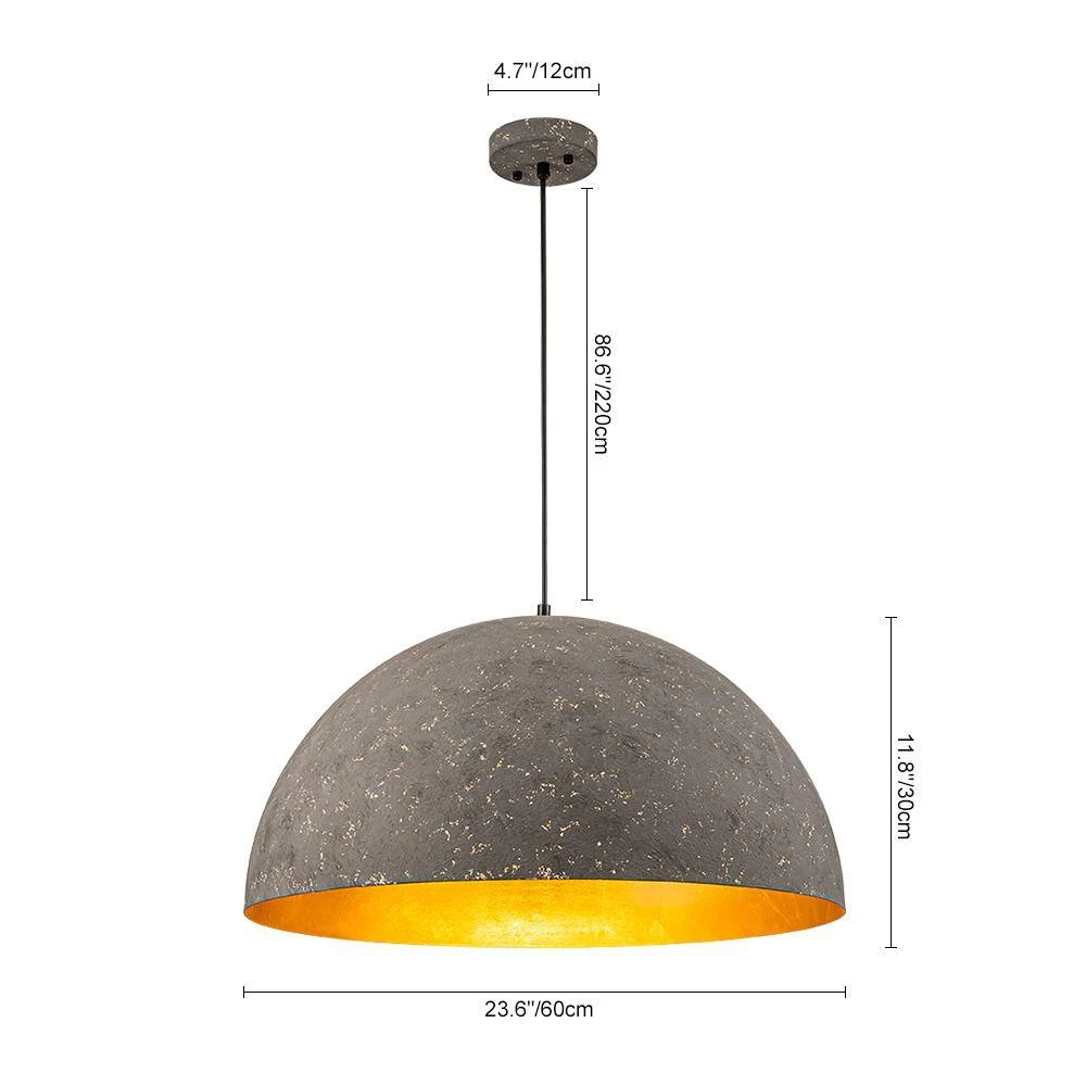 This 23.6 in. Dia dome pendant light combines a rustic gray-white exterior with subtle gold accents, complemented by a warm gold-foil interior, giving it a refined yet vintage aesthetic that enhances any room’s ambiance. The dome’s wide shape and elegant finish create a sophisticated statement, perfect as a chandelier alternative in kitchens, dining areas or living rooms. Designed to suit various styles, from farmhouse to industrial, this pendant provides both a modern decorative touch and functional ambient lighting. Its versatile design supports installation on sloped or vaulted ceilings, ensuring it fits seamlessly into any home decor.
