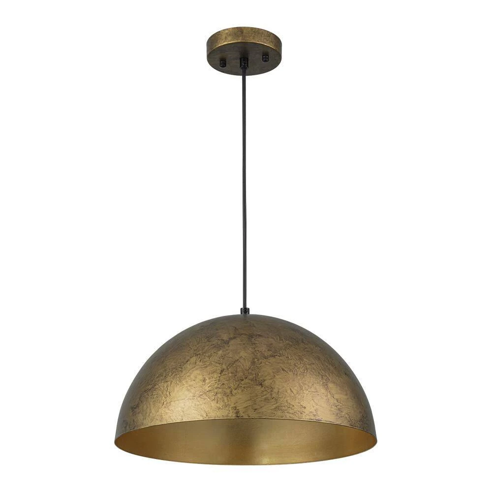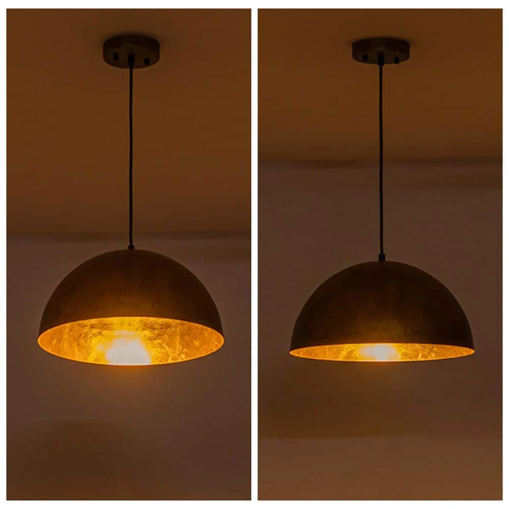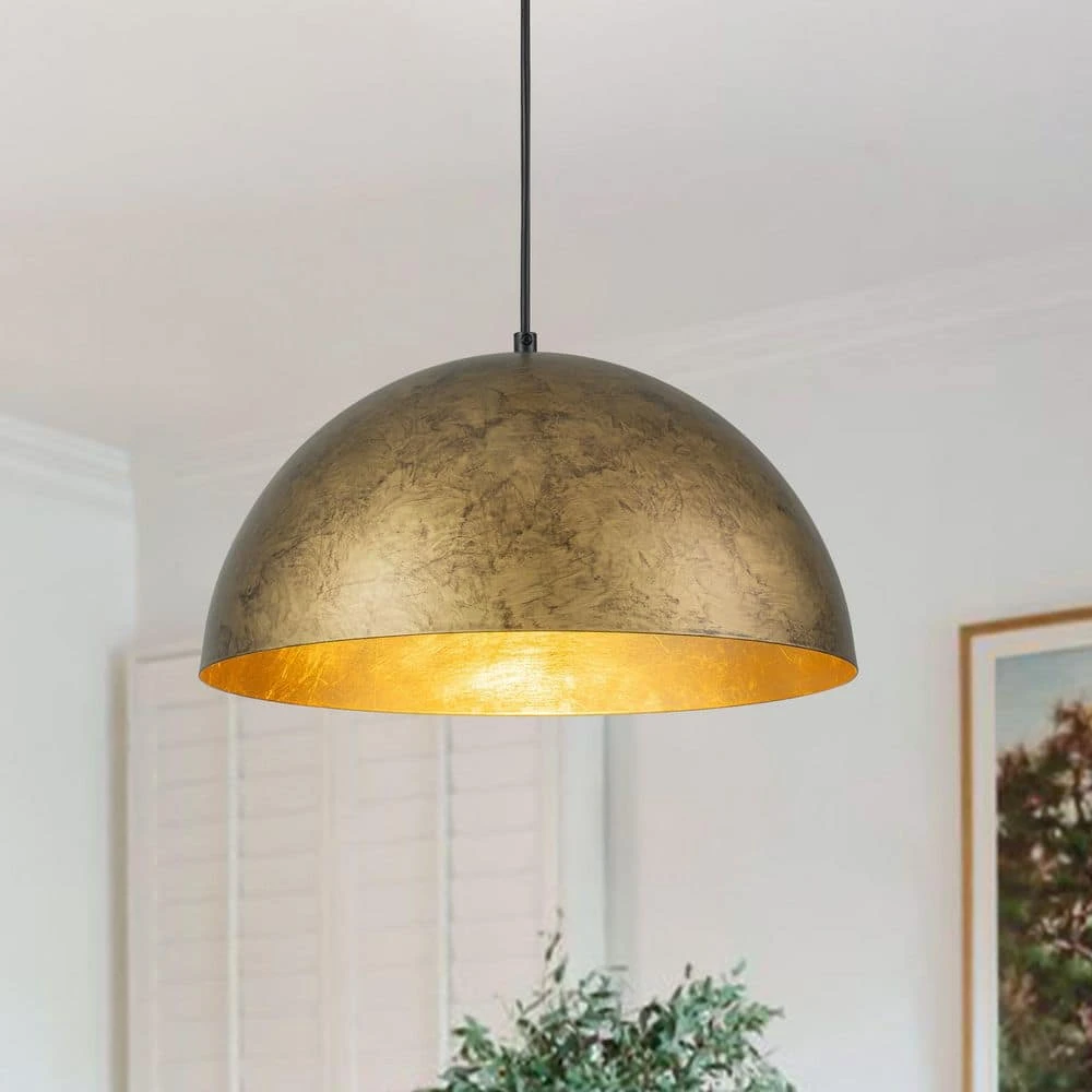 Bring timeless charm and industrial flair to your home with the Single Dome Pendant Light. Featuring a striking 2-tone design, this pendant light showcases an antique Brass exterior and a gold foil interior, creating a warm and inviting glow. The 15 in. Dia dome shade, shaped like a classic industrial pot cover, makes a bold statement and enhances the ambiance of any room. This pendant light is perfect for illuminating dining rooms, kitchens, or living spaces, and its E26 socket provides ample task lighting or soft, ambient illumination. Whether you’re creating a cozy atmosphere above a kitchen island or making a statement in your entryway, the half-globe pendant light blends modern functionality with vintage-inspired design.