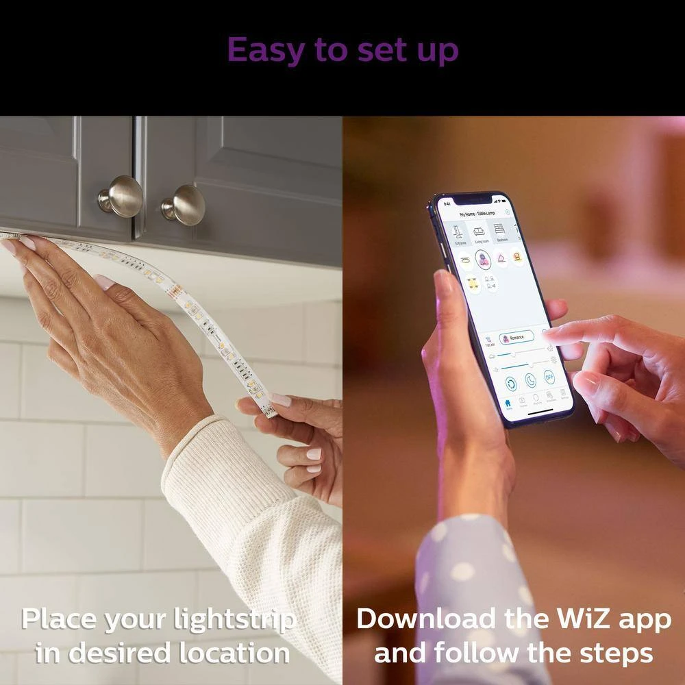 Philips Smart Wi-Fi LED lighting puts you in complete control of your lighting with smart bulbs and accessories that are easy to use, functional and affordable. This Smart Color and Tunable White Light Strip lets you live life colorfully, just connect it to your existing Wi-Fi network. This starter kit includes a light strip and power adapter. Attach the flexible light strip on any solid surface in any shape you like using the included adhesive tape. Dynamic light modes make any room glow in your favorite color. Or use tunable white light that adjusts from warm white to cool-daylight. Use app presets to choose the perfect lighting for your daily activities. You can play with millions of colors, thousands of shades of white and enjoy pre-set well-being modes to find the perfect light temperature. Control your lights wherever you are using the WiZ app or your favorite compatible voice control device. This product requires a Wi-Fi connection to operate wirelessly. Compatible with Google Assistant, Alexa and Siri Shortcuts. Philips Wi-Fi lighting is WiZ-connected and controlled with the WiZ app. Not compatible with Philips Hue.