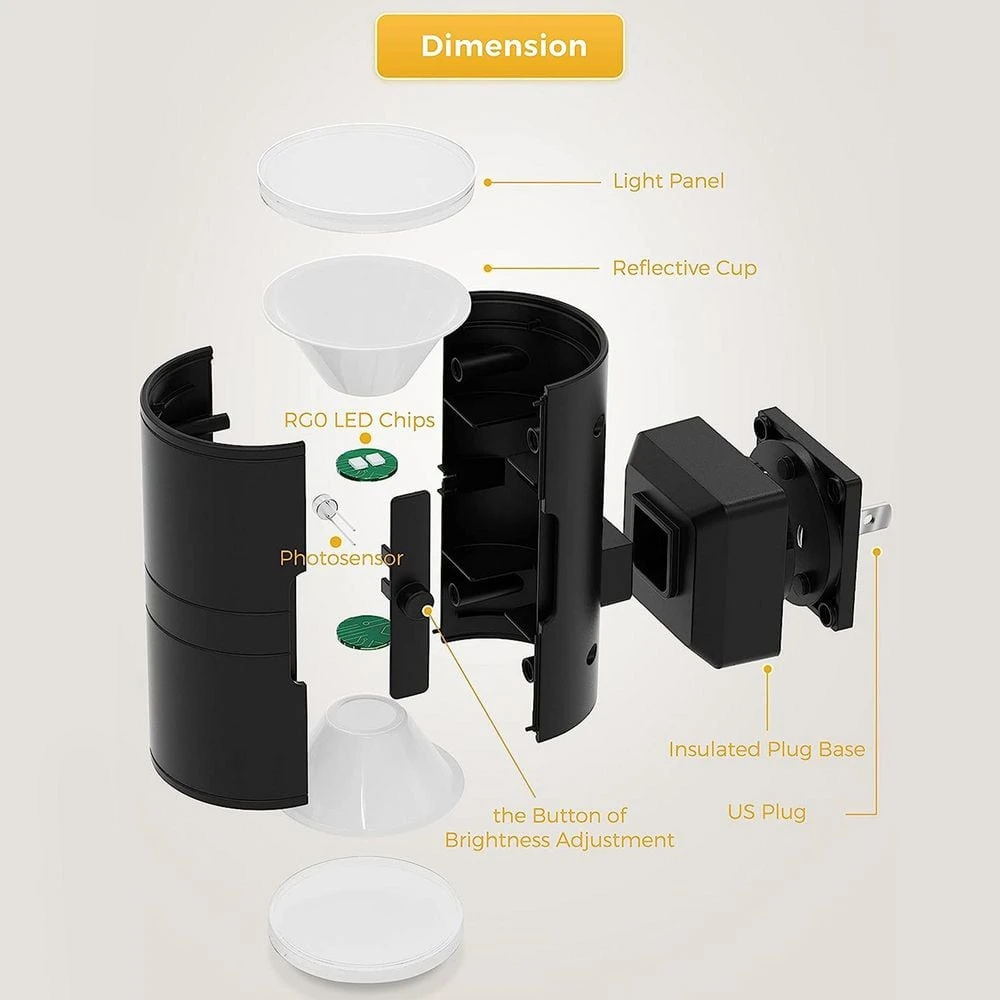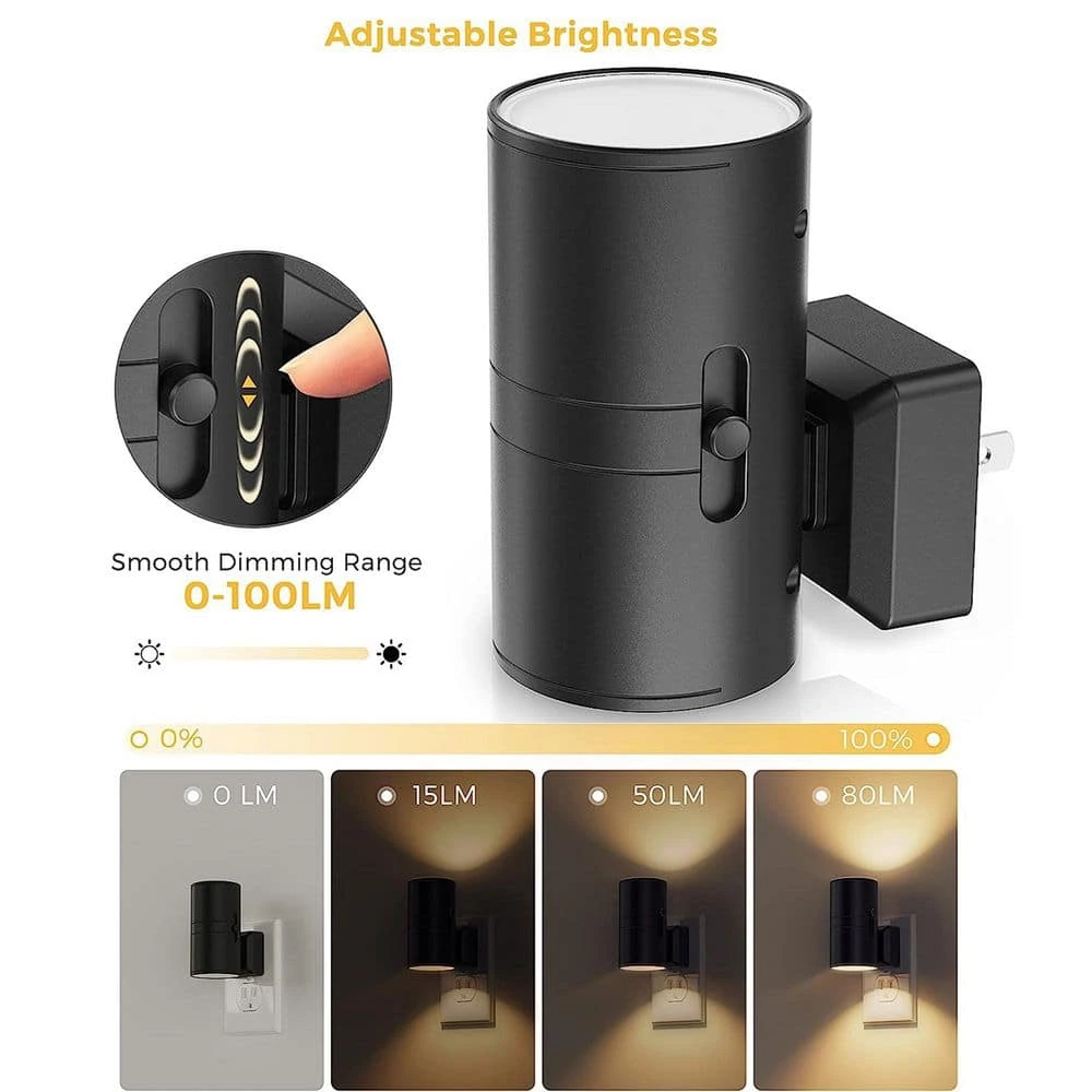 This plug-in night light features a sleek black cylinder design that mimics a wall sconce, adding decorative style and subtle illumination to any space. Its built-in light sensor automatically turns the light on at dusk and off at dawn, ensuring effortless energy savings. The slide dimmer allows for smooth 0-100% brightness adjustment, making it ideal for bedrooms, hallways, and nurseries.
