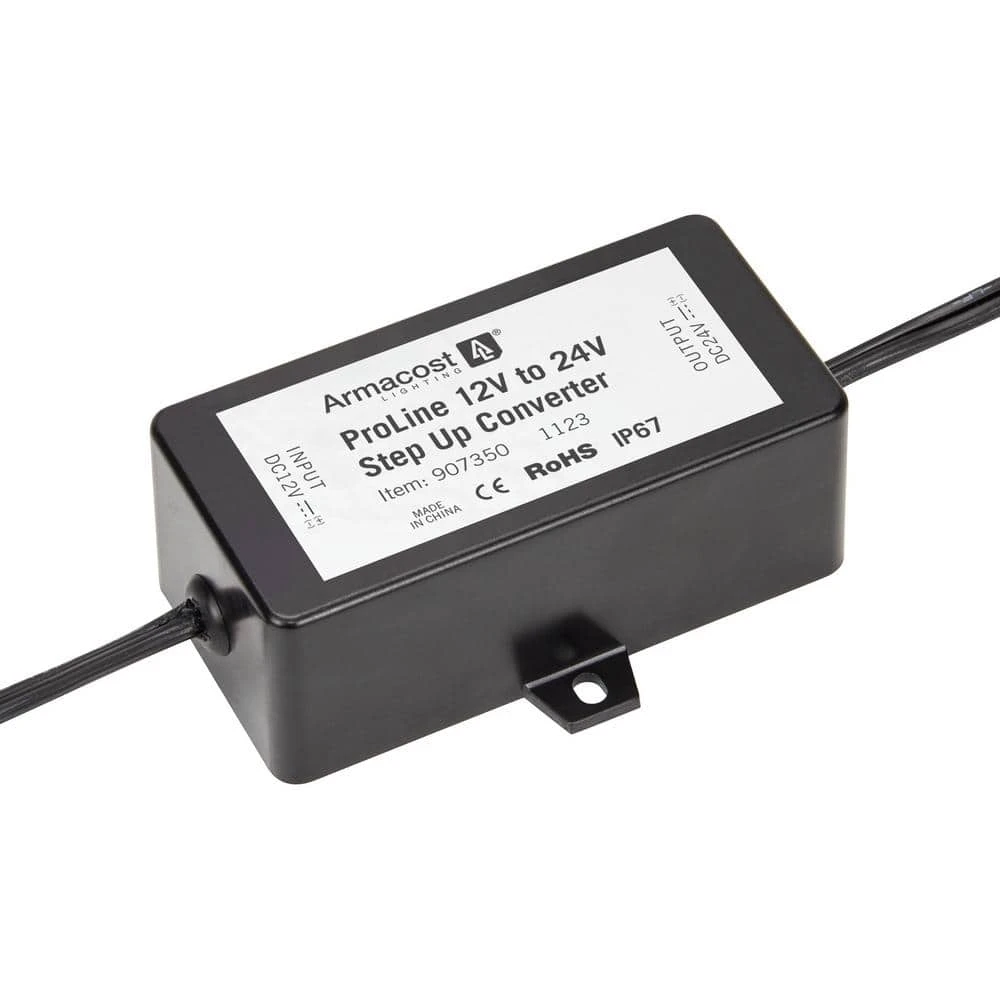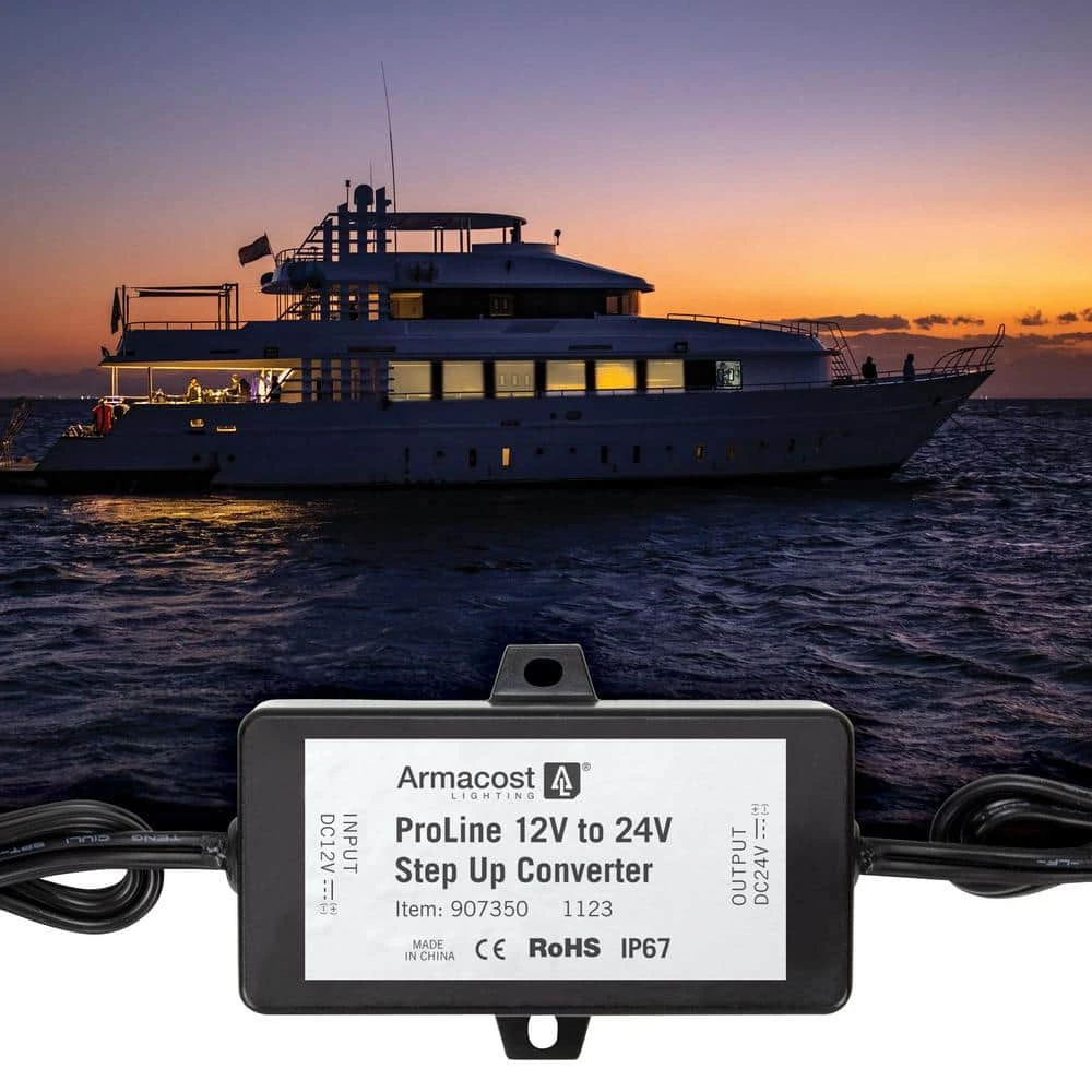 Compatible with Armacost Lighting LED lights and power supplies, the ProLine 12-Volt to 24-Volt Step Up Converter allows 24-Volt LED lighting to be used with 12-Volt systems commonly found in boats, RVs, cars and trucks. The DC-DC boost converter is compact, lightweight and easy to conceal in installations. 12-Volt DC to 24-Volt DC converters can be used in boat, RV and automotive lighting and electronics, surveillance and security systems, car audio devices, telecommunications equipment and amateur radio applications.
