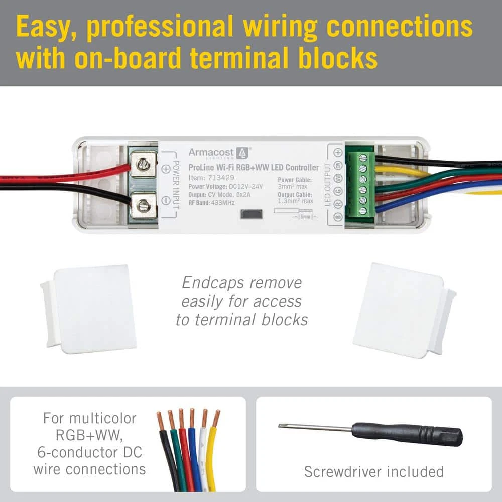 The ProLine Multicolor RGB plus WW Wi-Fi LED Controller from Armacost Lighting includes a sleek RF remote control and compact receiver. Paired with the Tuya Smart app, the LED controller can be used to choose preset colors, adjust brightness and select white LED color temperature on multicolor RGB plus WW LED tape light. Featuring professional-grade components, the LED remote control is easy to install and works through walls and doors.