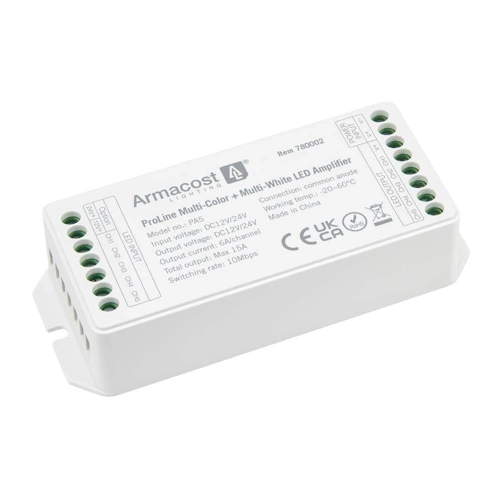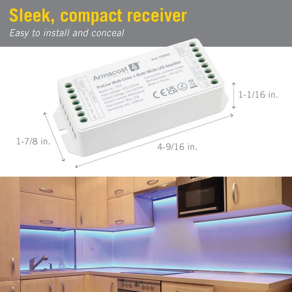 The ProLine Multicolor RGB plus WW LED Amplifier from Armacost Lighting acts as a repeater for RGB plus WW color changing LED strip lights. Perfect for long LED lighting installations, the LED amplifier is compact in size and easy to conceal. The LED repeater does not generate power, so it must be paired with an additional power supply to repeat remote signals. When paired with the ProLine Multicolor RGB plus WW Wi-Fi LED Controller, your installations can be controlled wirelessly using the Tuya smart app.