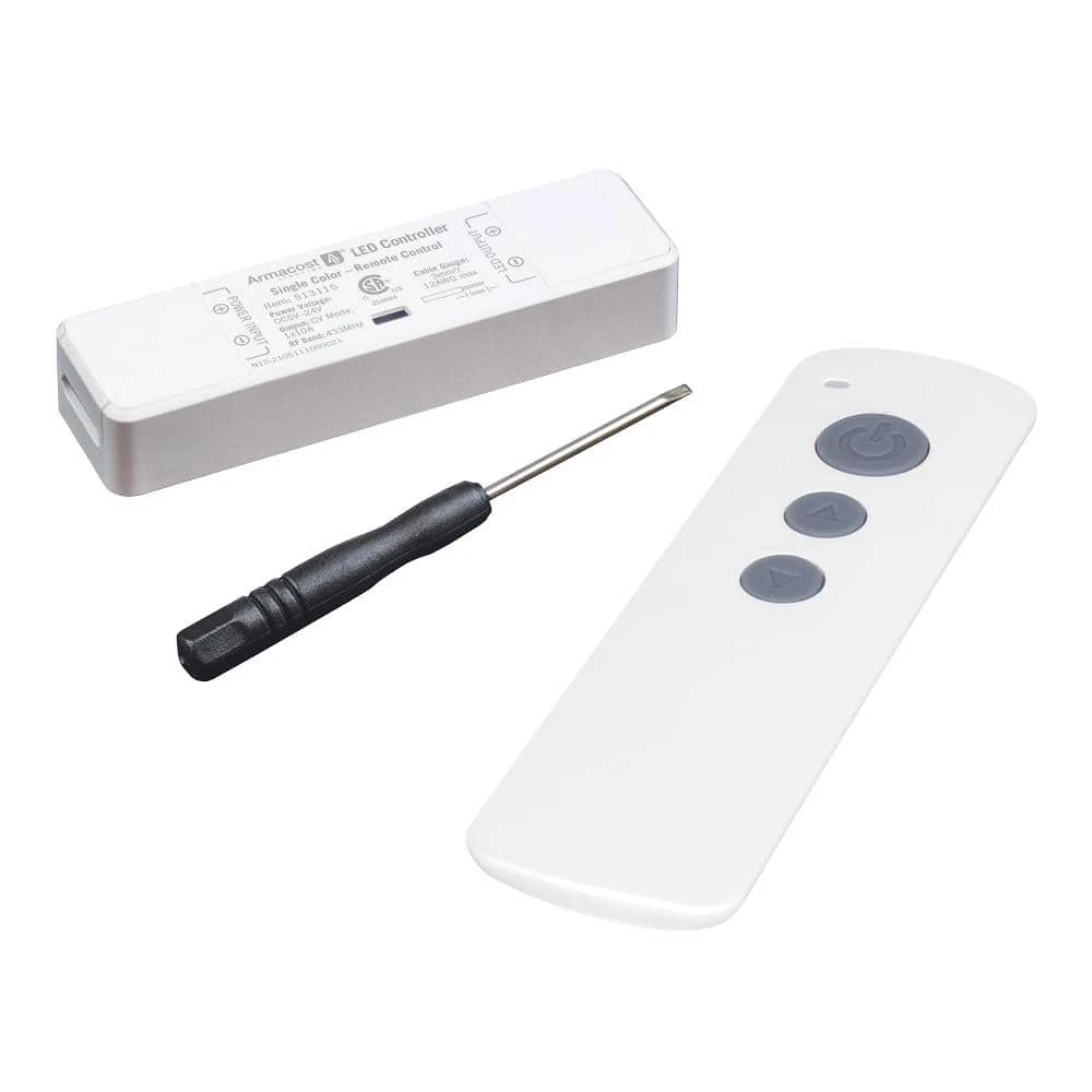 The Armacost Lighting ProLine White or Single-Color LED Lighting Remote Controller is compact and ultra-slim. Designed to function seamlessly with White or Single Color LED tape light installations. The LED light controller works through cabinets, doors and walls up to 50 ft. away, using Radio Frequency (RF) technology. The controller has dimming functionality, that allows brightness to be controlled from 0 to 100%. The LED controller is great for LED lighting installations of any size and works with 12-Volt and 24-Volt LED lighting and power supplies. LED lighting remote control works seamlessly in both commercial and residential installations.