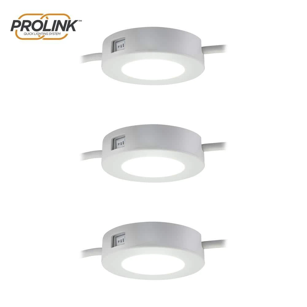 Create your own professional lighting setup with this set of three Ultra ProGrade ProLink LED Puck Lights. ProLink combines the best features you could want into each sleek, lightweight and high-powered puck. Providing a total 663 Lumens of fully diffused, premium-grade illumination, you will be amazed at how much better your space looks under these lights. These pucks also let you change the color temperature from cool white light to warm light or even daylight – all with the flip of a switch. Everything you need to mount the lights come included inside the box. You can customize your space even further by linking additional ProLink fixtures, whether they be other pucks or light bars. Conveniently connect them to each other with their included 18 in. linking cords. Improve upon your setup by pairing your pucks with awesome ProLink add-on modules, such as dimming, motion-sensing, USB power and direct wire (sold separately). The perfect fit for kitchens, office spaces, workbenches and more, your Ultra ProGrade ProLink LED Puck Lights provide you with lighting for life.