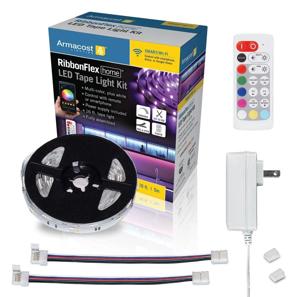 The Armacost Lighting RibbonFlex Home Multicolor RGB plus White Smart LED strip light kit is the perfect solution for versatile indoor or outdoor accent lighting including under cabinets, shelving, decks and patios. Full-range brightness and color control with included wireless remote; RF technology works through walls up to 50 ft. away. Adhesive backing for easy installation.