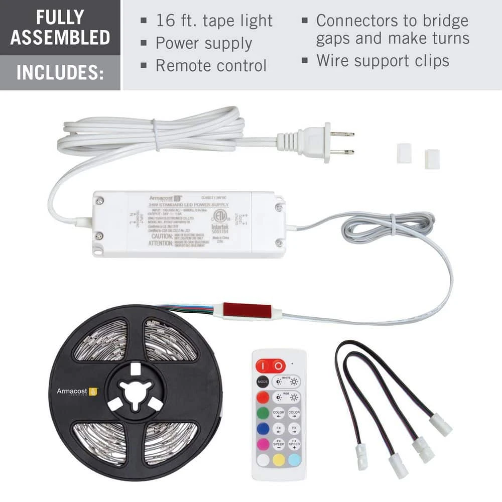 The Hardwire RibbonFlex Home RGB+ W LED Strip Light Kit from Armacost Lighting features a direct wire LED power supply for easy, at-home installation. The multicolor plus white tape light kit is a perfect all-around solution for any accent lighting project, including entertainment areas, kitchens, bedrooms or dorm rooms. Select from 25 preset color options, plus pure white. LED strip light kit comes with an RF (Radio Frequency) remote to control of color, dimming and LED lighting effects. Control up to three LED lighting kits with a single remote for larger custom installations.