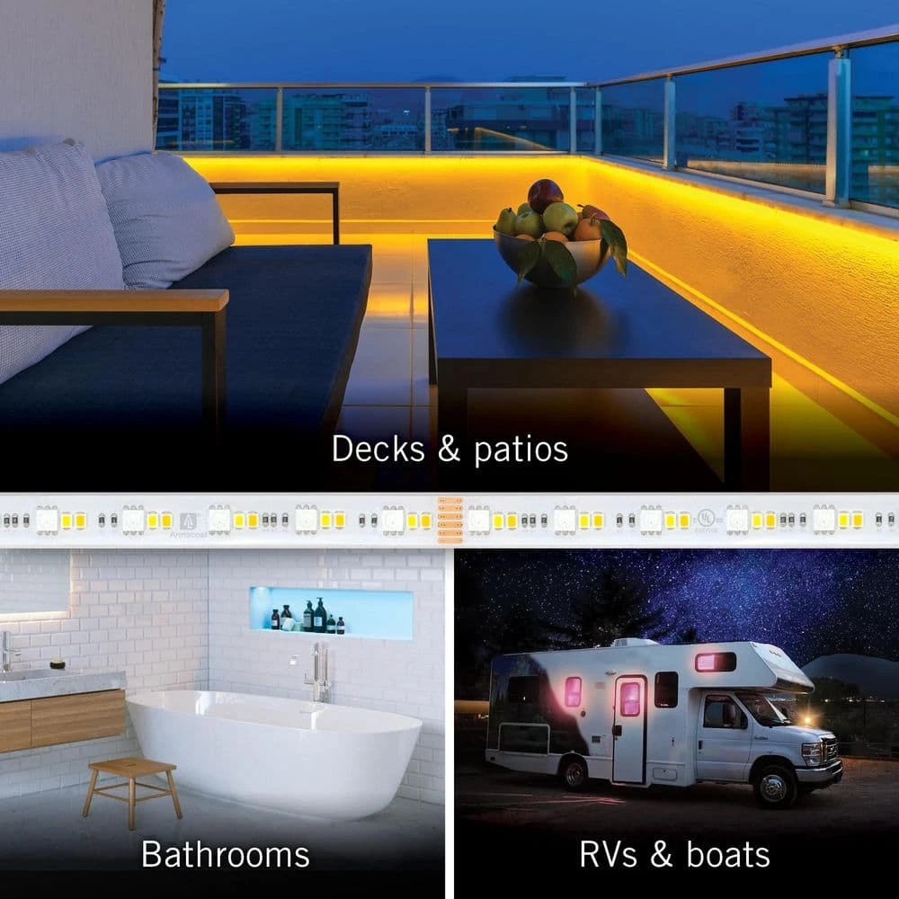 Featuring an IP67 waterproof rating, Armacost Lighting’s Multicolor RGBWW RibbonFlex Pro 24-Volt Outdoor LED Tape Light is perfect for any outdoor LED accent lighting installation, including decks, porches, landscapes, vehicles, docks, and more. RGB+WW strip light combines tunable white (2700K – 5000K) and RGB multicolor LED lights, providing versatile color and white lighting options. The 24-Volt silicone coated LED strips are 100% protected from dust and sand and protected against immersion in water between 5.9 – 39.37 in. (15cm – 1m) deep for up to 30 minutes.