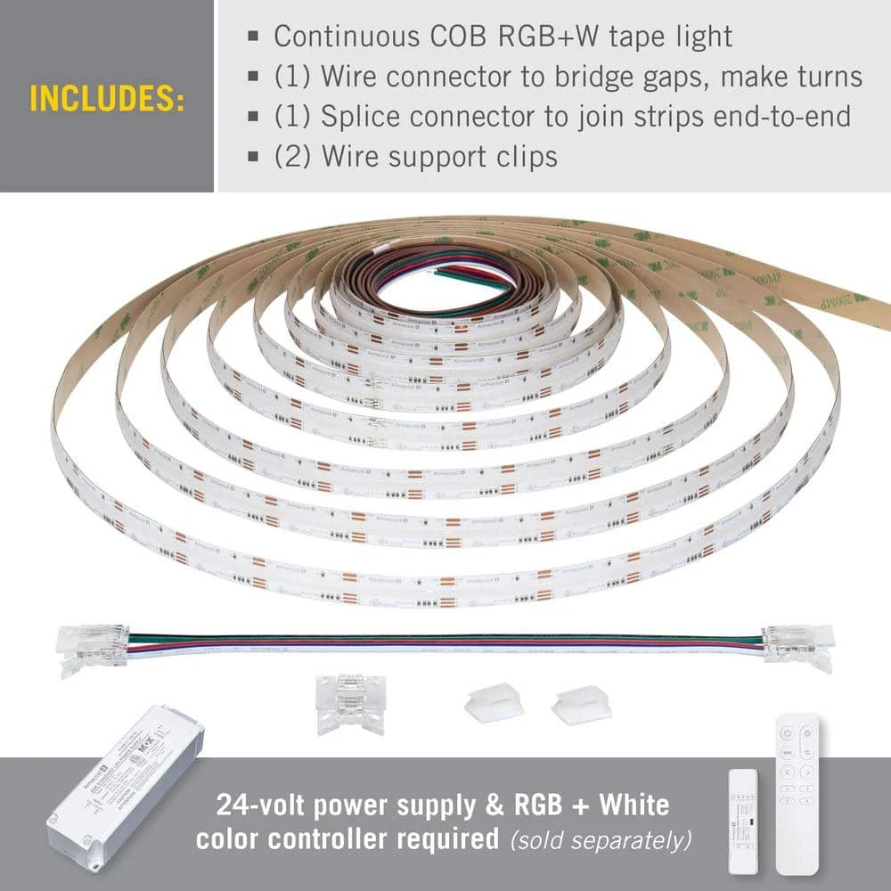 24-Volt RibbonFlex Pro multi-color RGBW LED COB Tape Light from Arm cost Lighting is a perfect choice for colorful accent lighting with a seamless glow. Excellent for reflective surfaces like counter tops and floors, dotless COB LED strip lights feature Chip-on-Board technology that create a continuous strip of light that is free of dots or spots. The multi-color plus White COB lights produce a variety of rich colors and a pure 3000K soft white. 24-Volt LED Driver and a RGB+W multi-color LED Controller for dimming and color control required and sold separately.