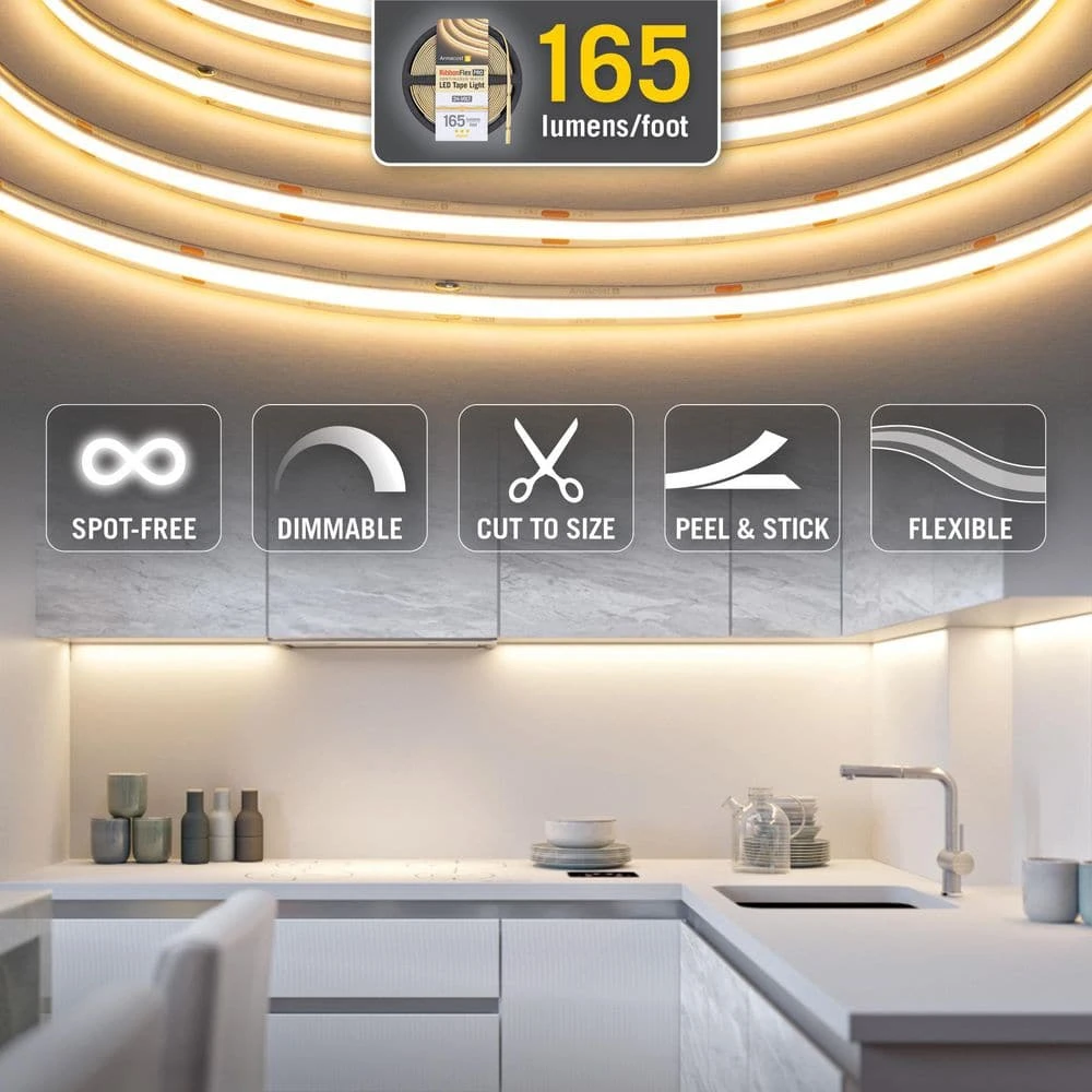 The Armacost Lighting RibbonFlex Pro 24-Volt Continuous LED Strip Light is the perfect solution for seamless accent lighting. Using Chip-on-Board (COB) technology, the LED strip light produces a seamless strip of light that is free of spots or breaks. These LED strip lights are designed to meet the layout and installation requirements of lighting professionals and feature high-quality, professional-grade components that are longer lasting and create a premium look. COB LED light tape is ideal for many applications including above and under cabinet lighting, tray ceiling lighting and toe kicks. They are especially perfect for installations next to shiny surfaces like counter tops or floors. Use with an Armacost Lighting 24-Volt power supply (required) and optional dimmer or switch, both sold separately.